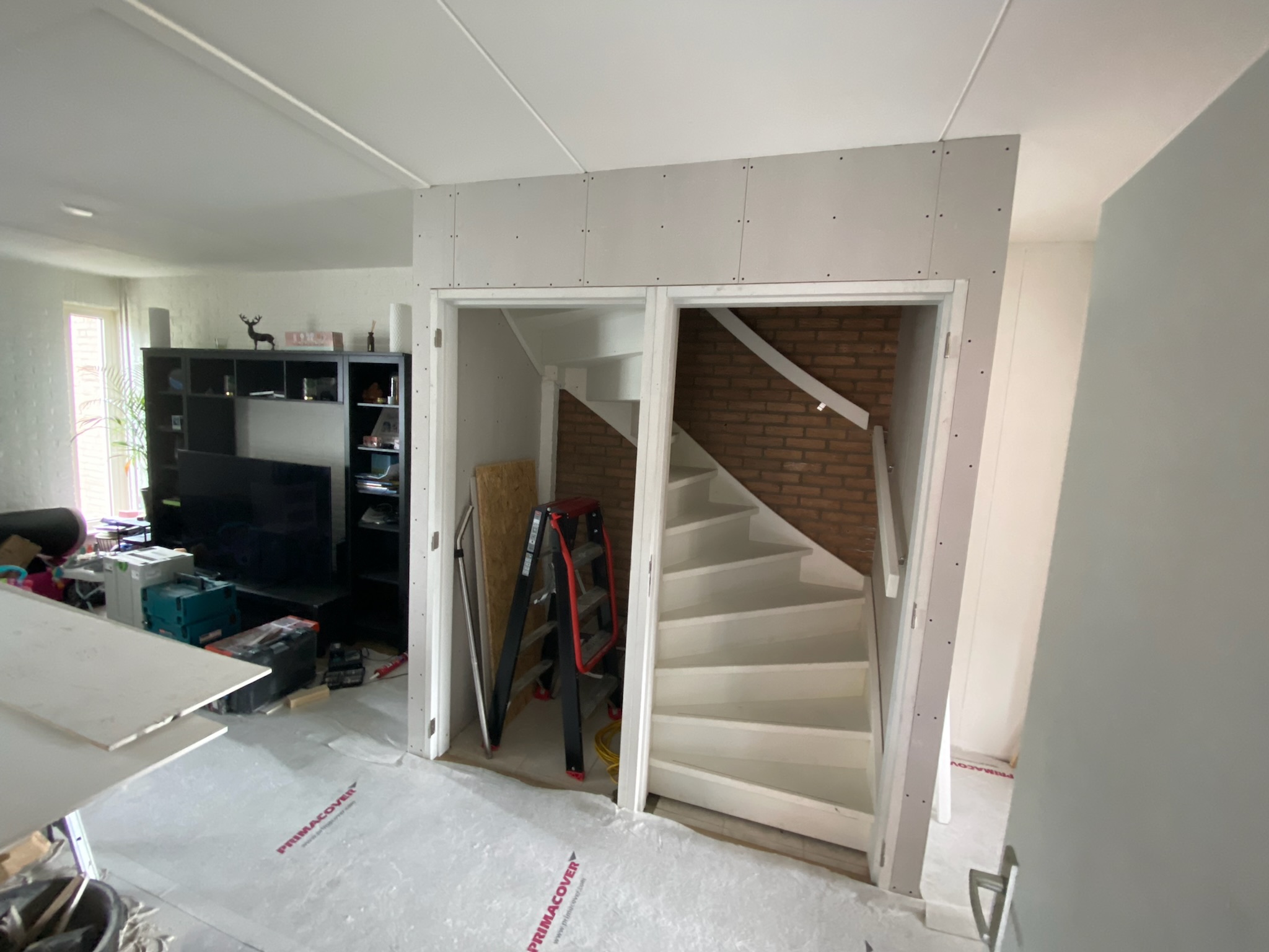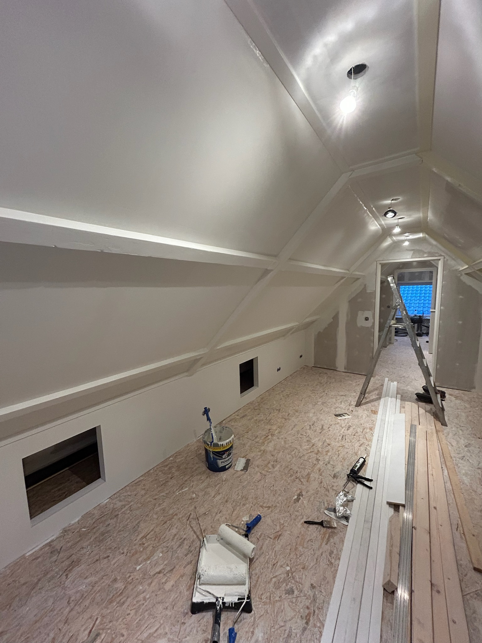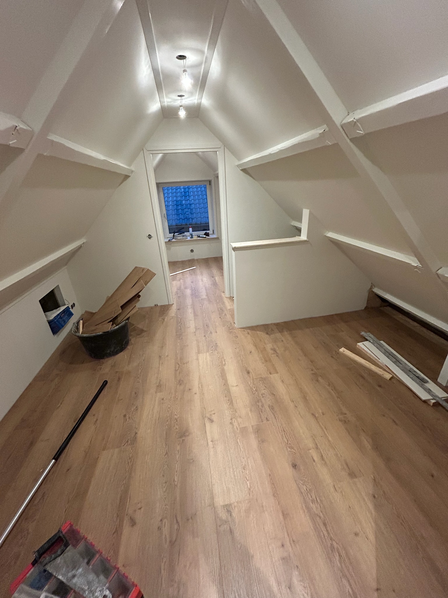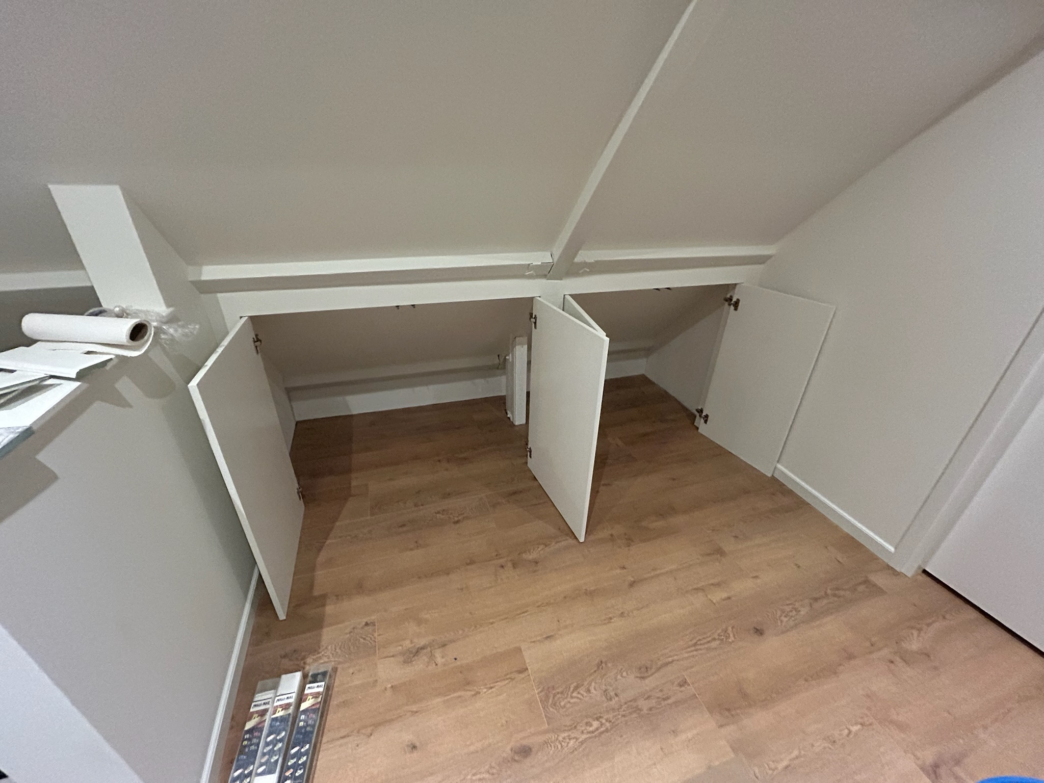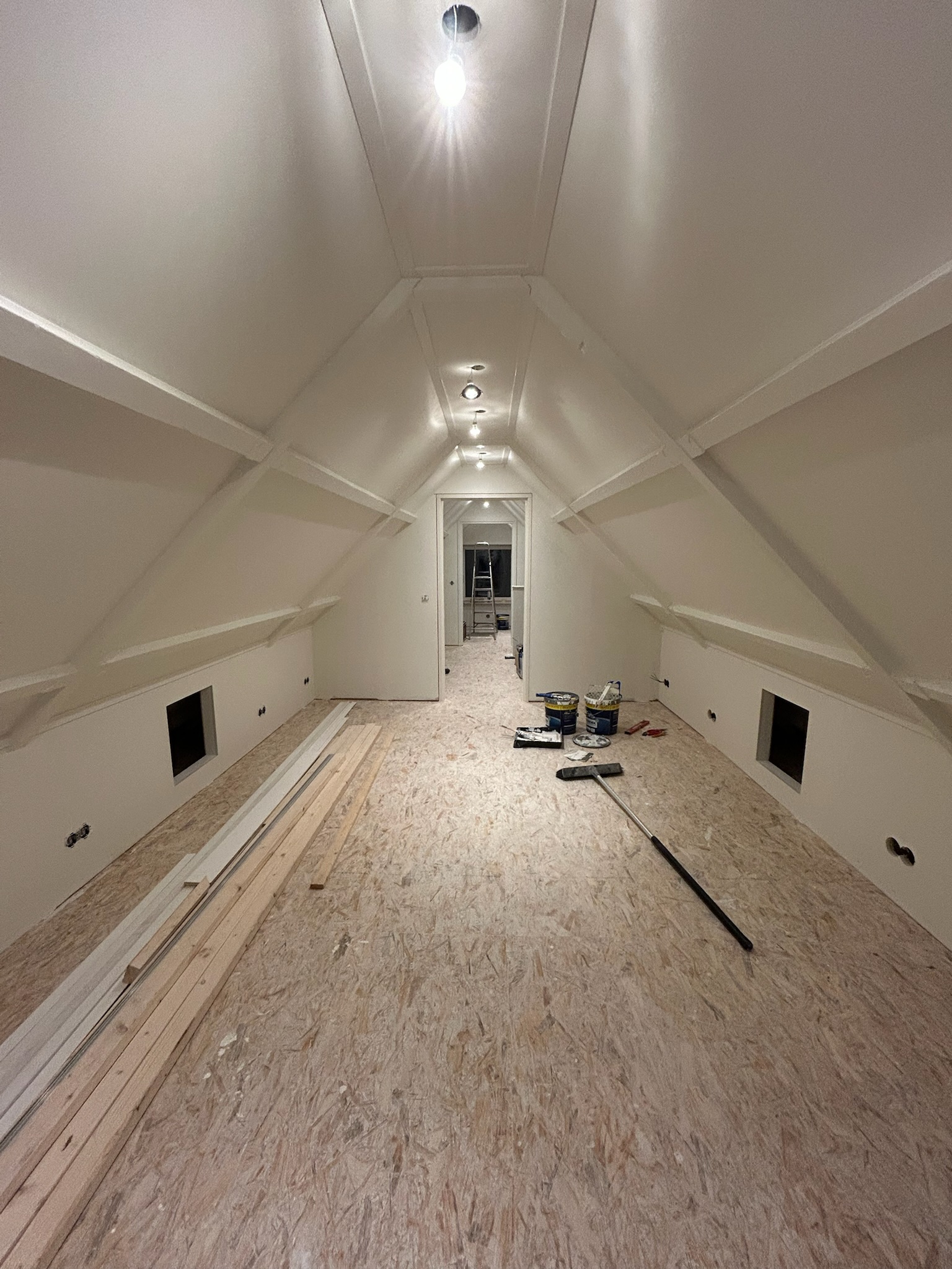 Bij de verbouwing op de 1e verdieping van deze woning hebben we ook de toegang verbetert middels een nieuwe trap. Verder is het de dak van binnenuit geïsoleerd en afgewerkt met gips platen net als beide kopgevels en hebben we de ruimte achter de knieschotten optimaal benut door er kast ruimte in de verwerken.