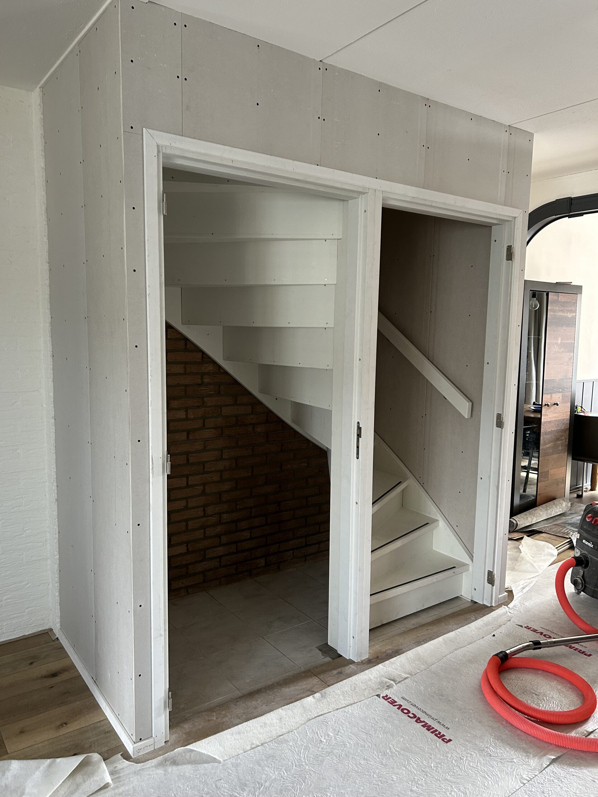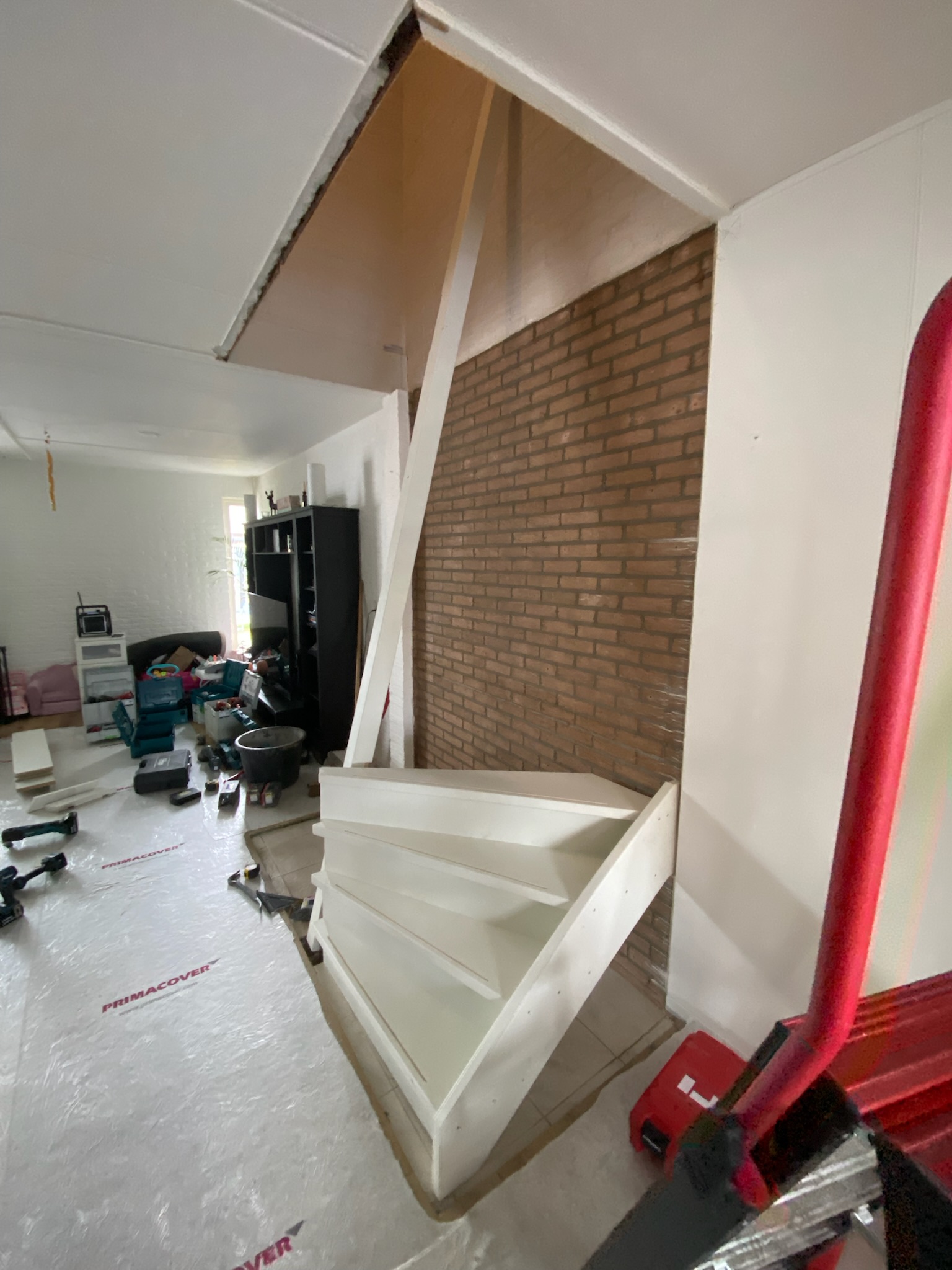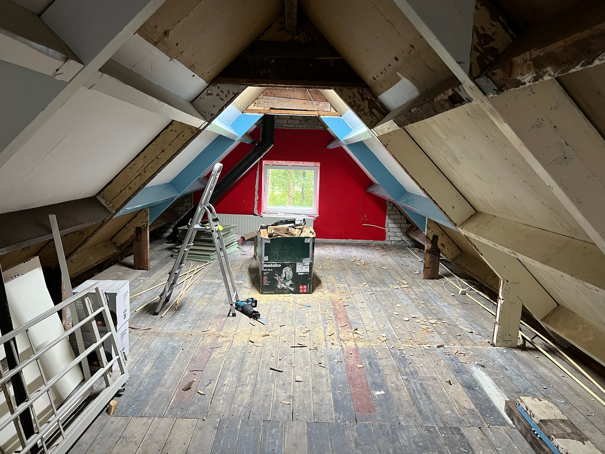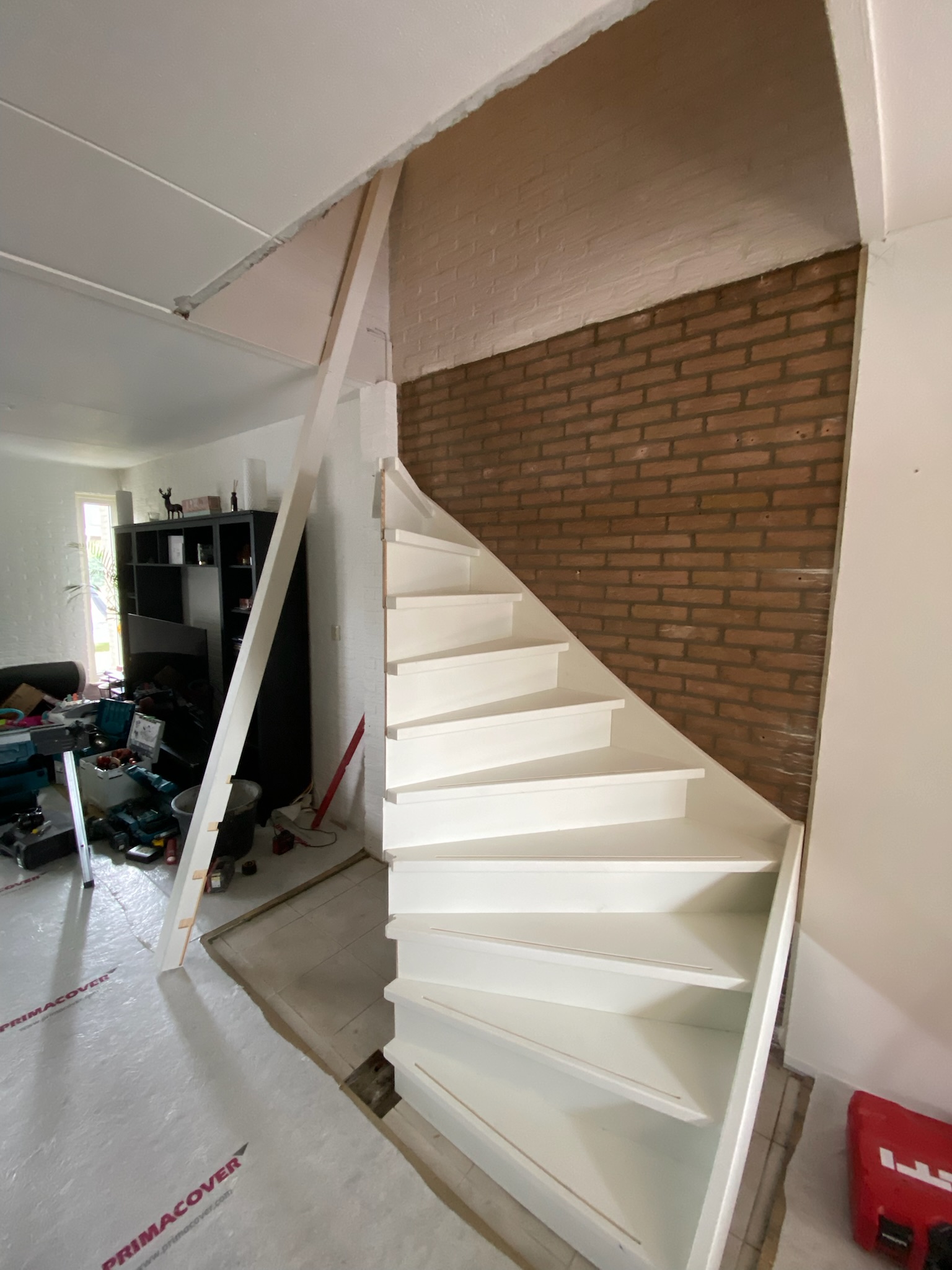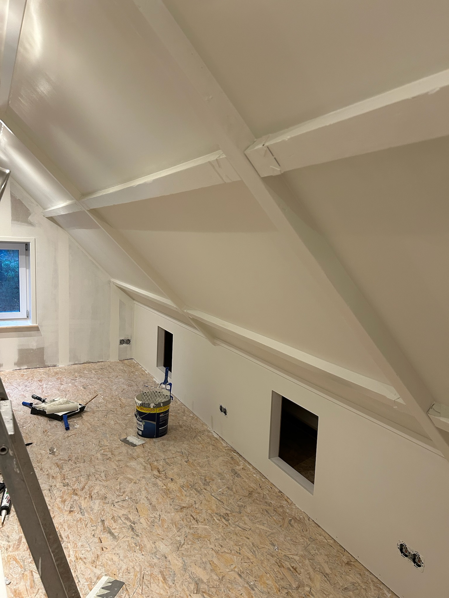 Bij de verbouwing op de 1e verdieping van deze woning hebben we ook de toegang verbetert middels een nieuwe trap. Verder is het de dak van binnenuit geïsoleerd en afgewerkt met gips platen net als beide kopgevels en hebben we de ruimte achter de knieschotten optimaal benut door er kast ruimte in de verwerken.