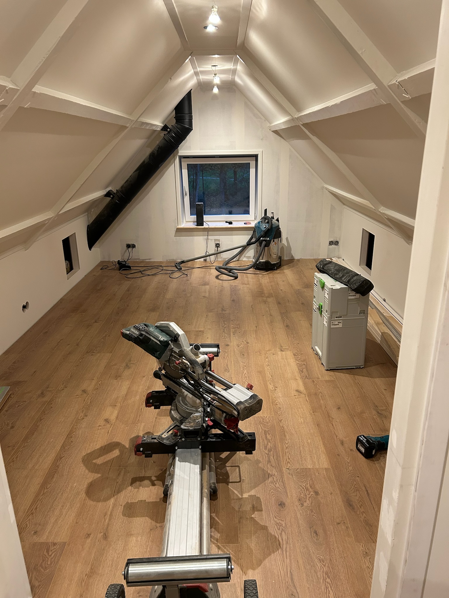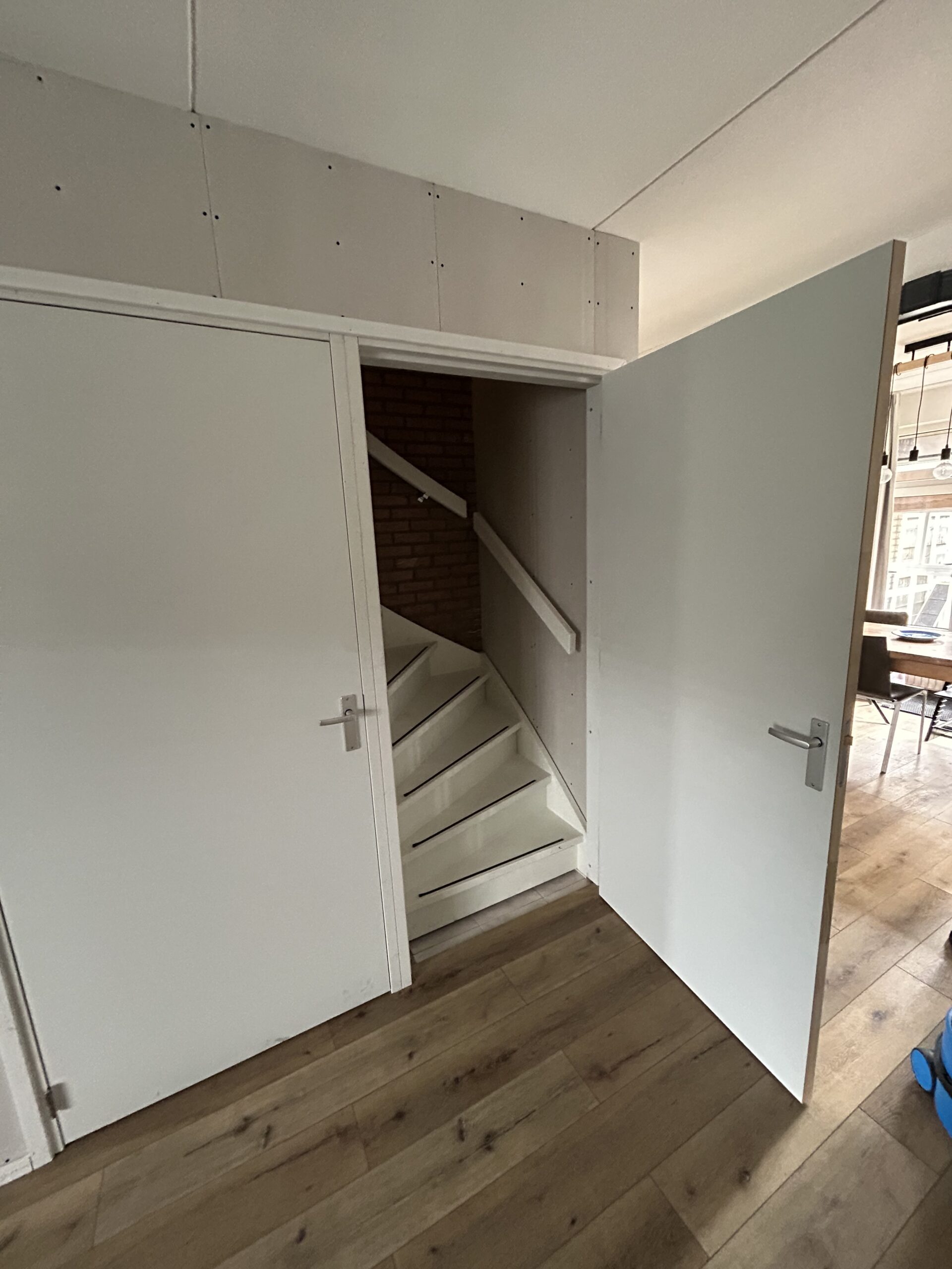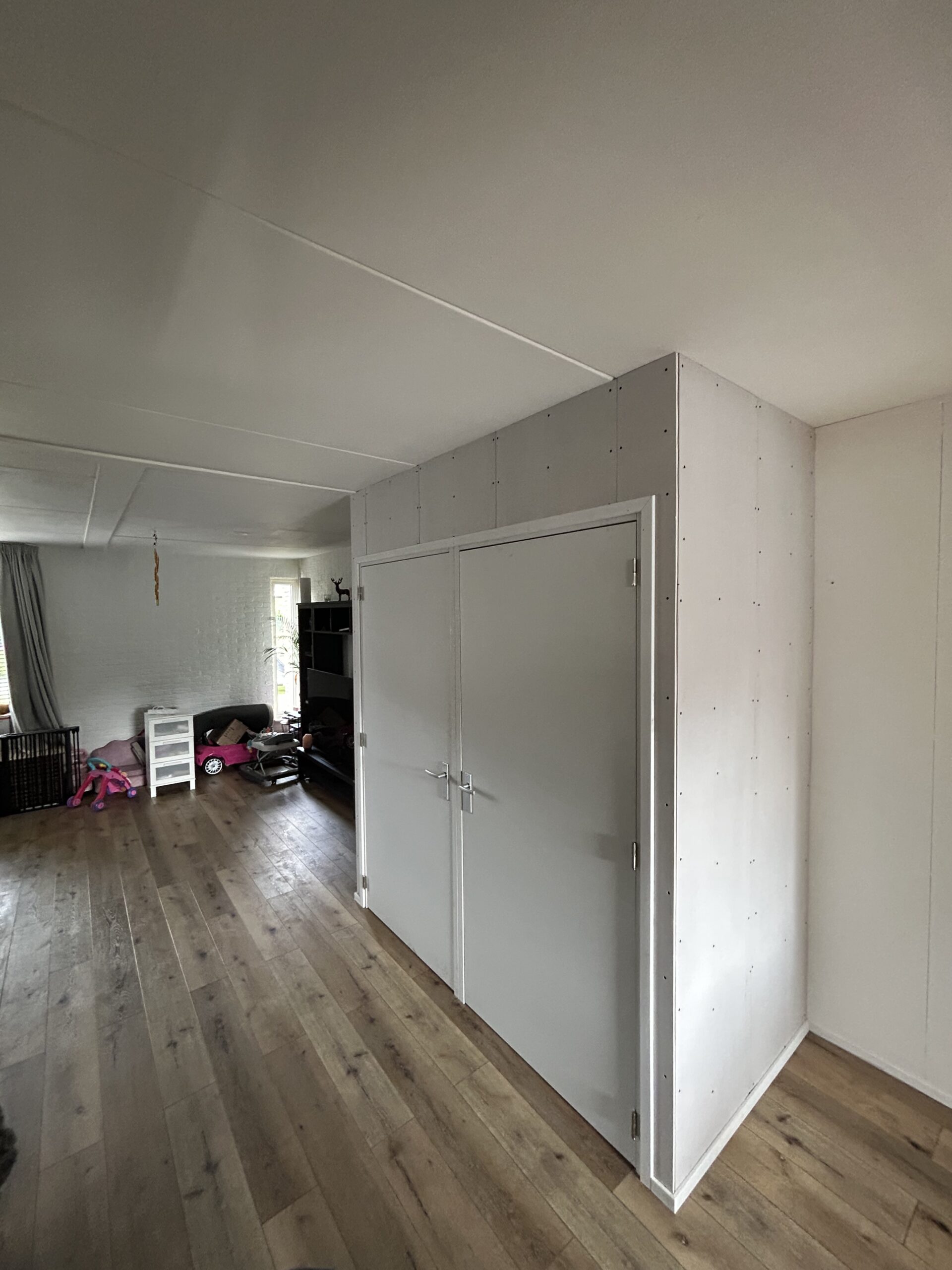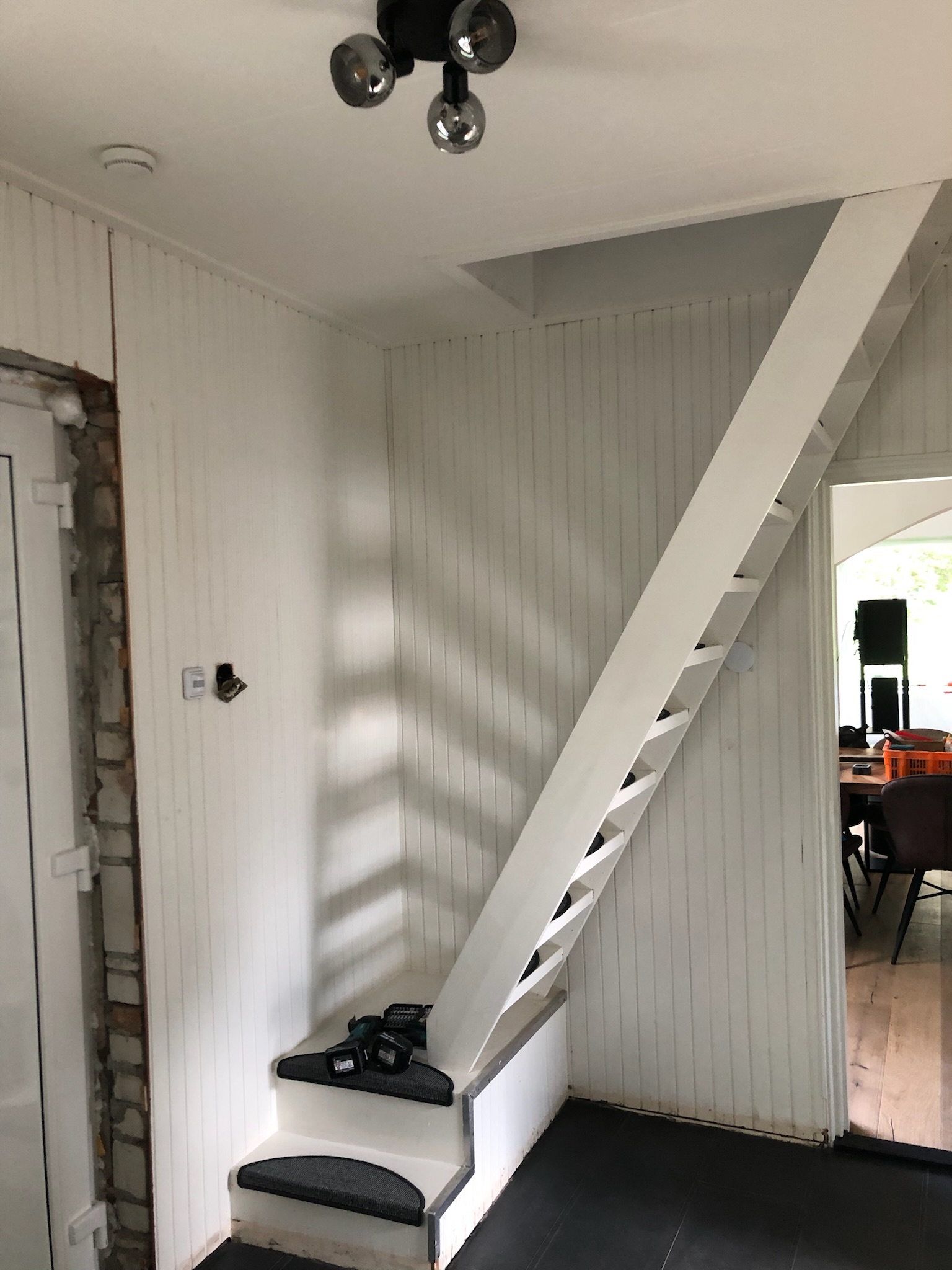 Bij de verbouwing op de 1e verdieping van deze woning hebben we ook de toegang verbetert middels een nieuwe trap. Verder is het de dak van binnenuit geïsoleerd en afgewerkt met gips platen net als beide kopgevels en hebben we de ruimte achter de knieschotten optimaal benut door er kast ruimte in de verwerken.