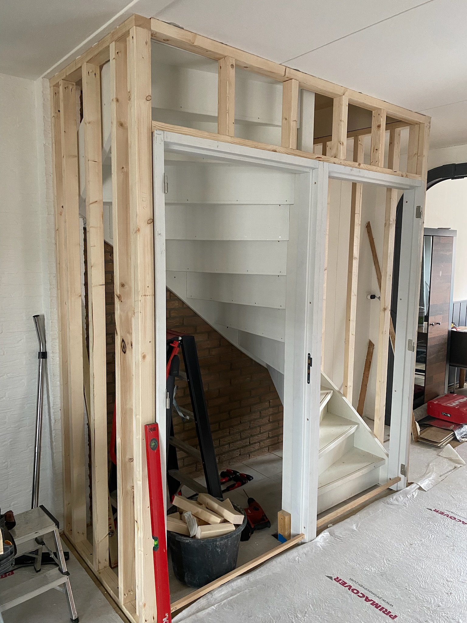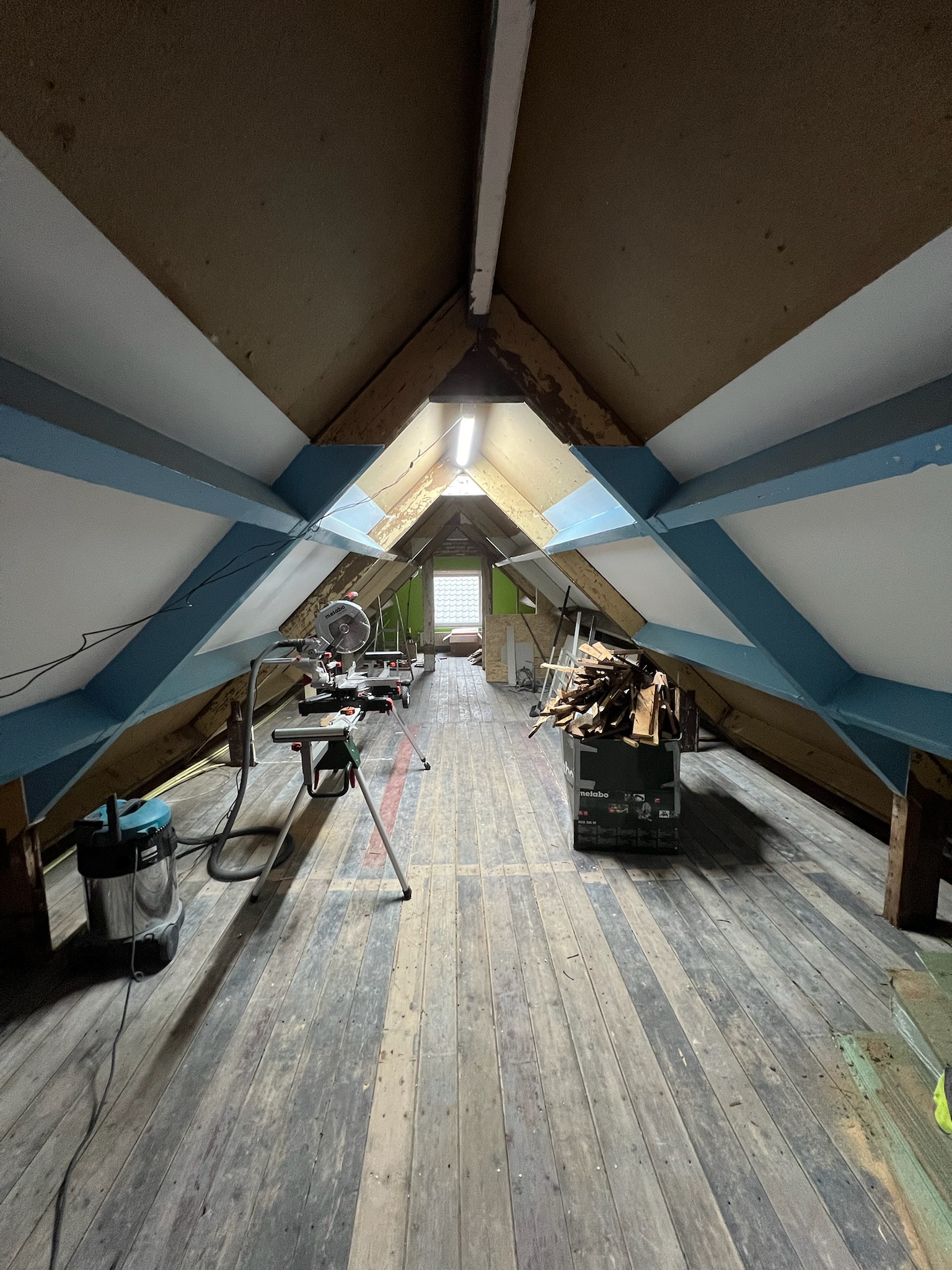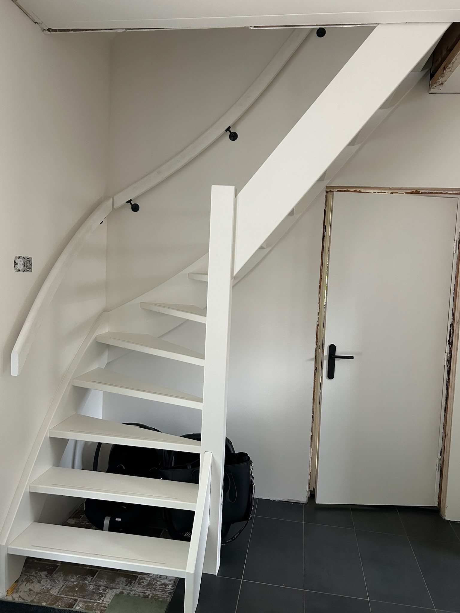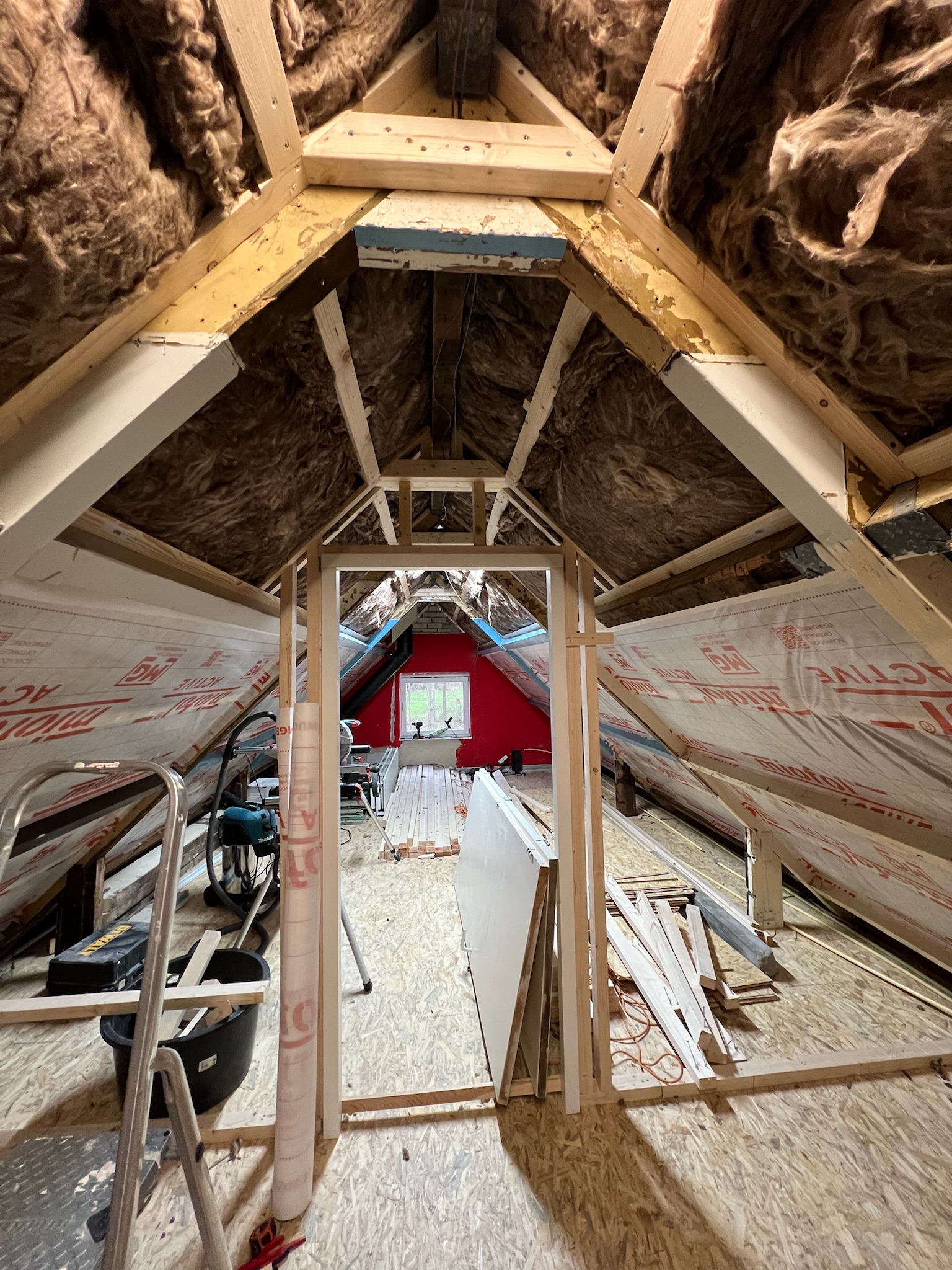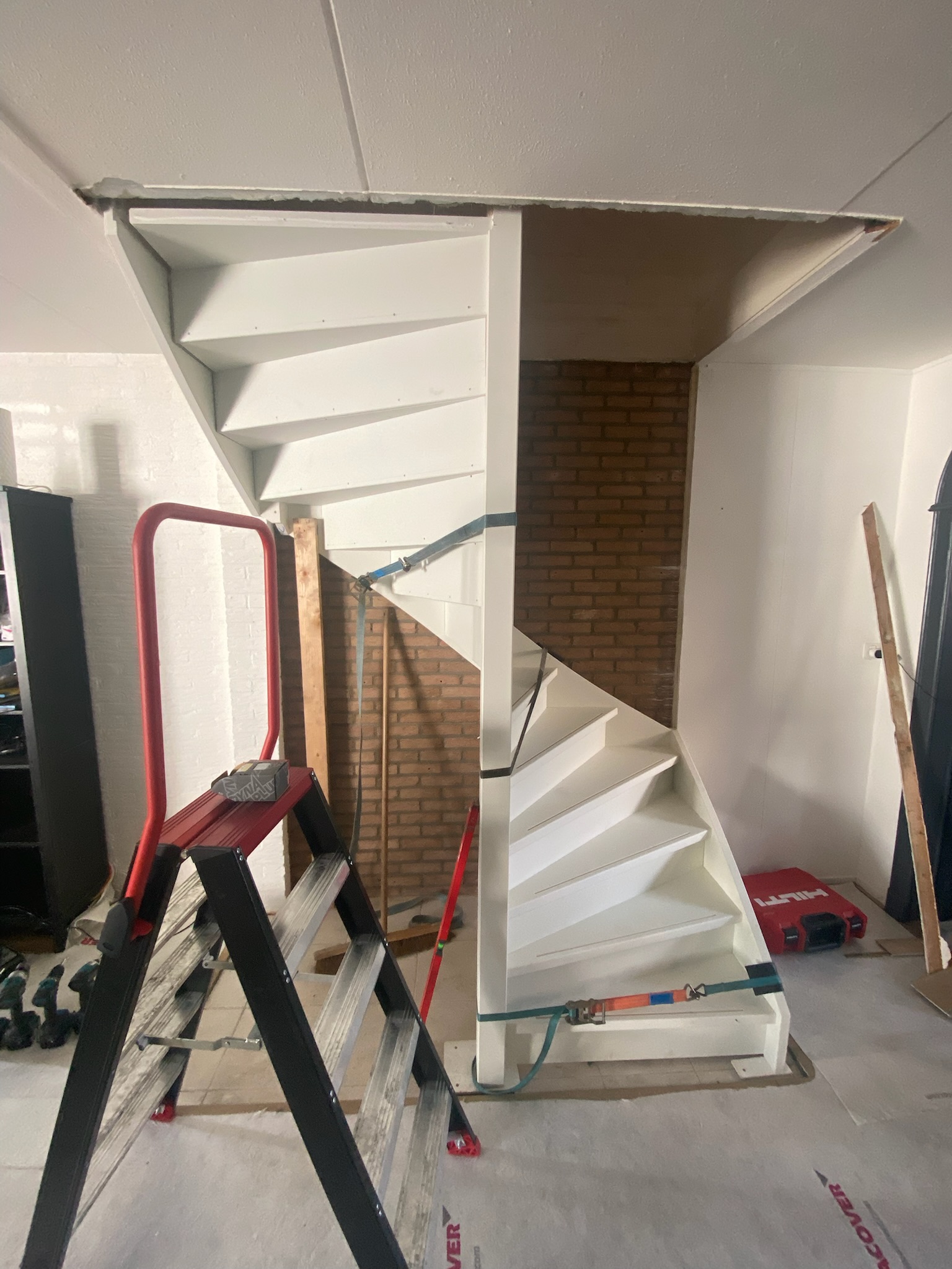 Bij de verbouwing op de 1e verdieping van deze woning hebben we ook de toegang verbetert middels een nieuwe trap. Verder is het de dak van binnenuit geïsoleerd en afgewerkt met gips platen net als beide kopgevels en hebben we de ruimte achter de knieschotten optimaal benut door er kast ruimte in de verwerken.