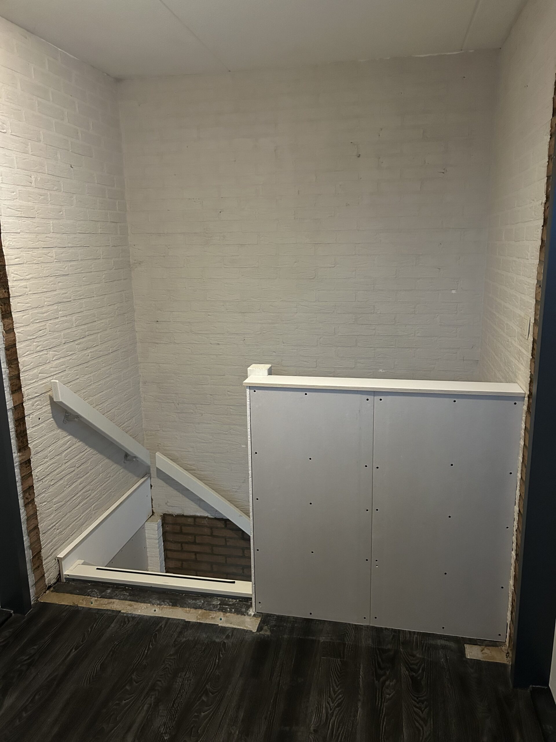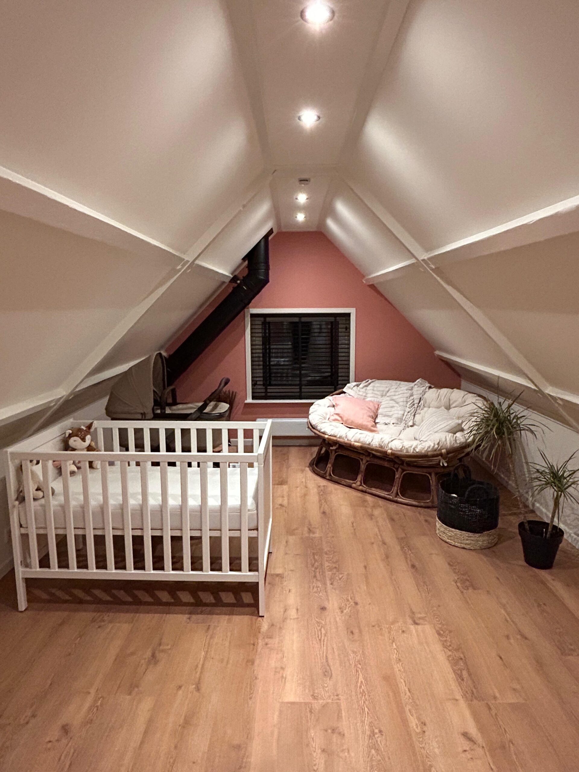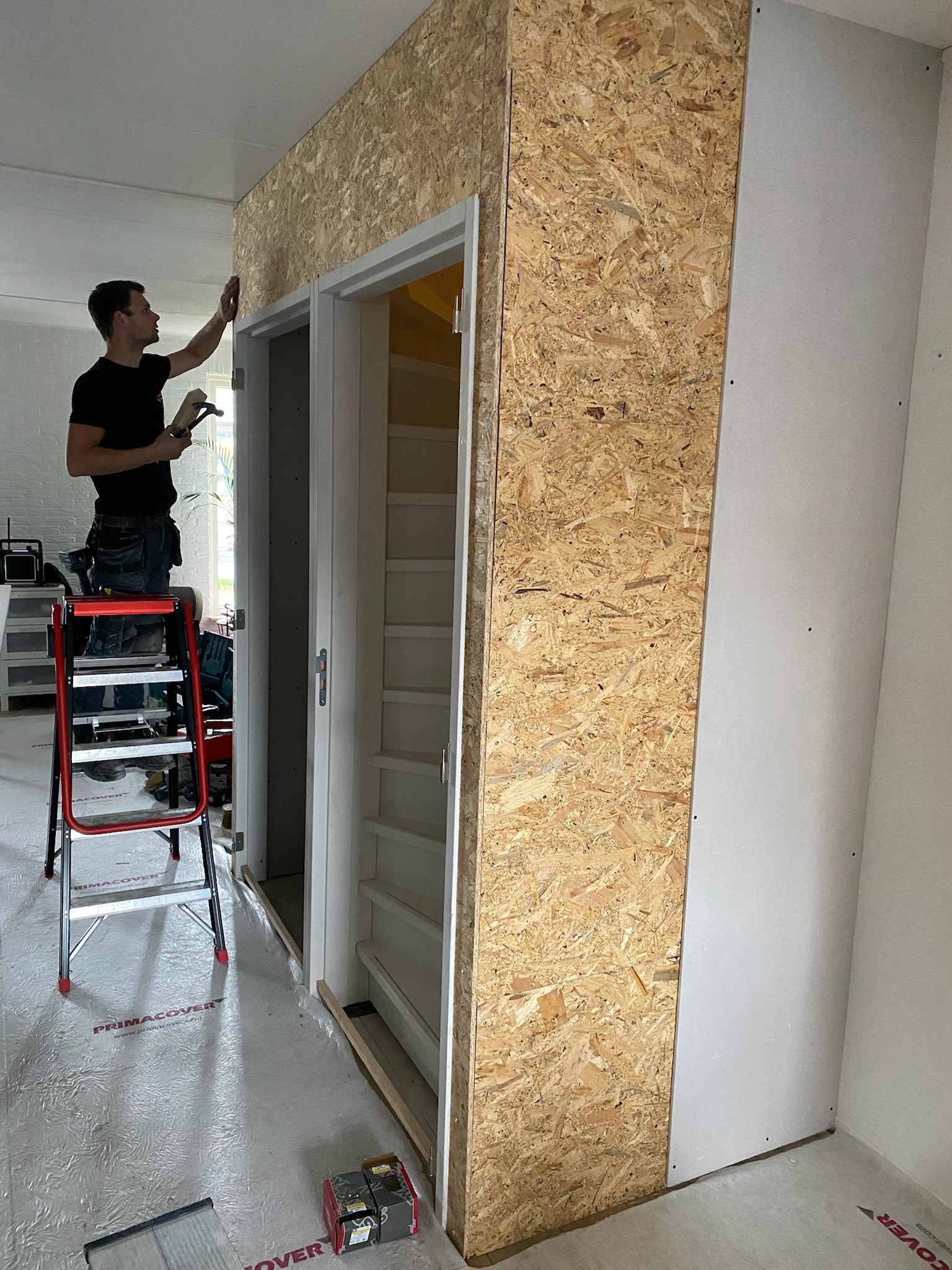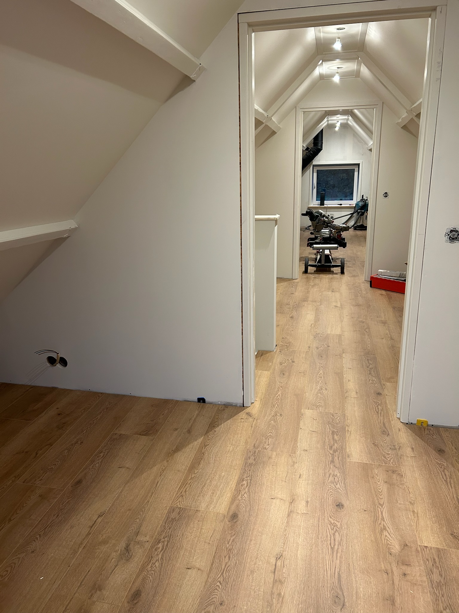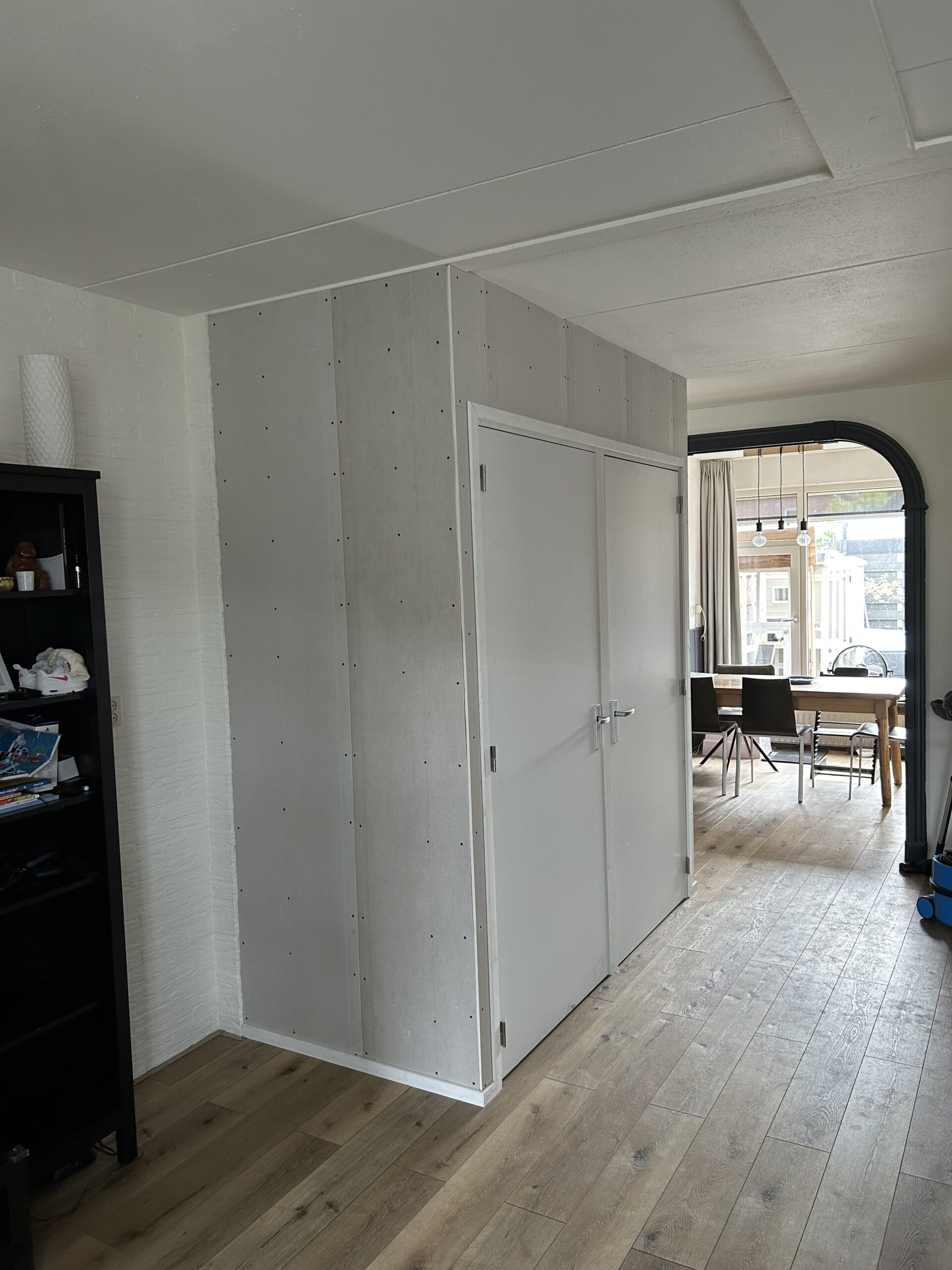 Bij de verbouwing op de 1e verdieping van deze woning hebben we ook de toegang verbetert middels een nieuwe trap. Verder is het de dak van binnenuit geïsoleerd en afgewerkt met gips platen net als beide kopgevels en hebben we de ruimte achter de knieschotten optimaal benut door er kast ruimte in de verwerken.