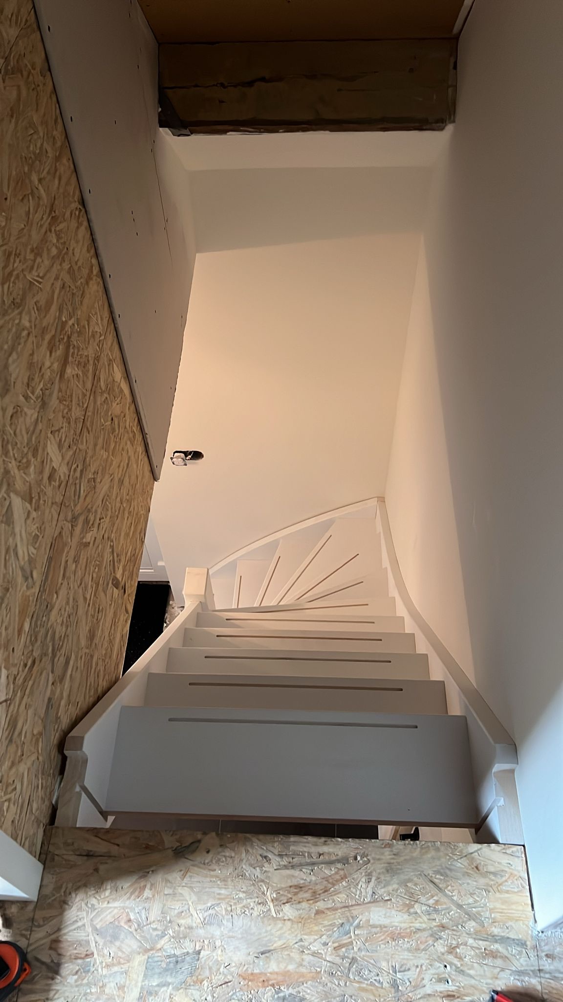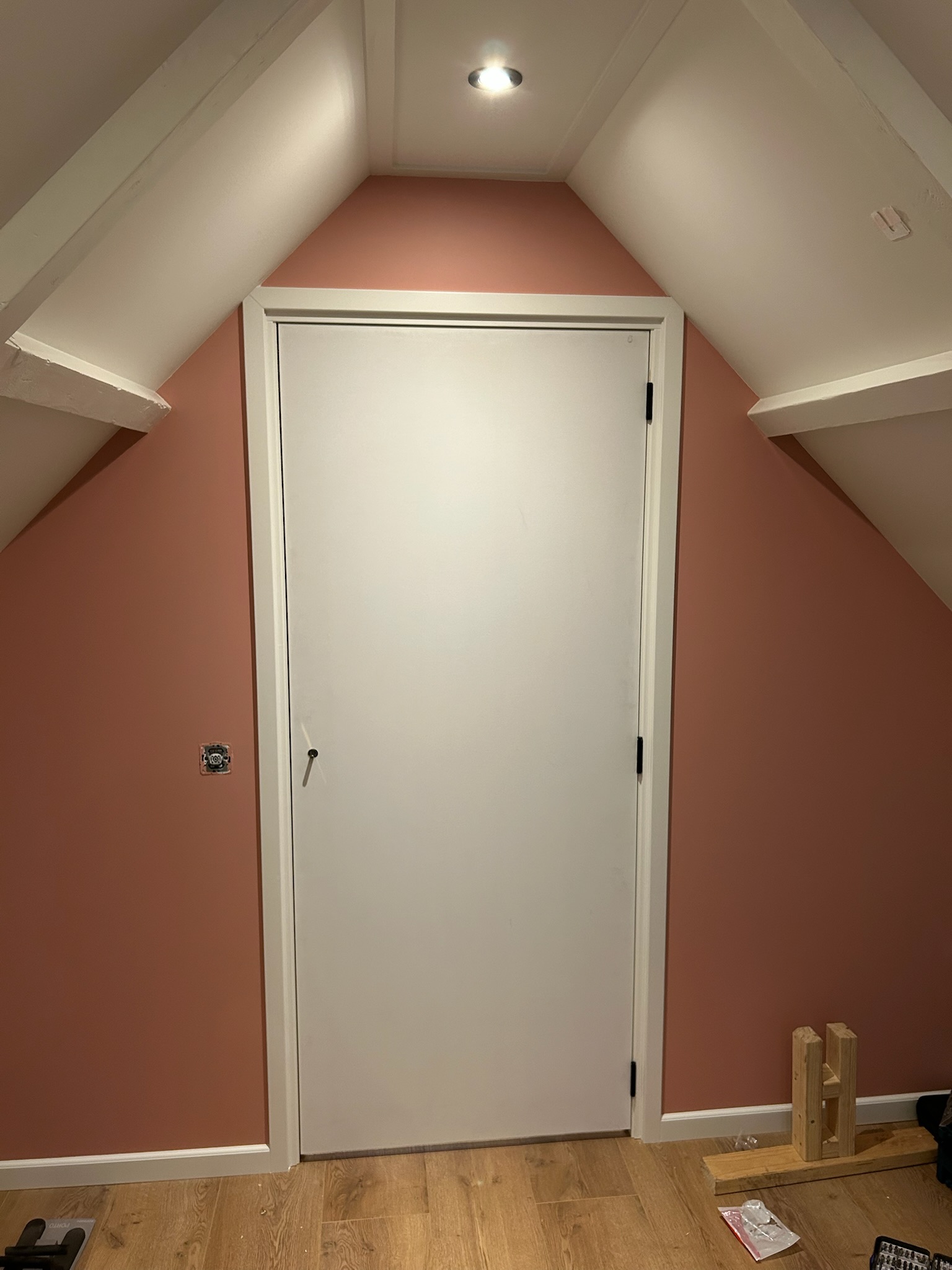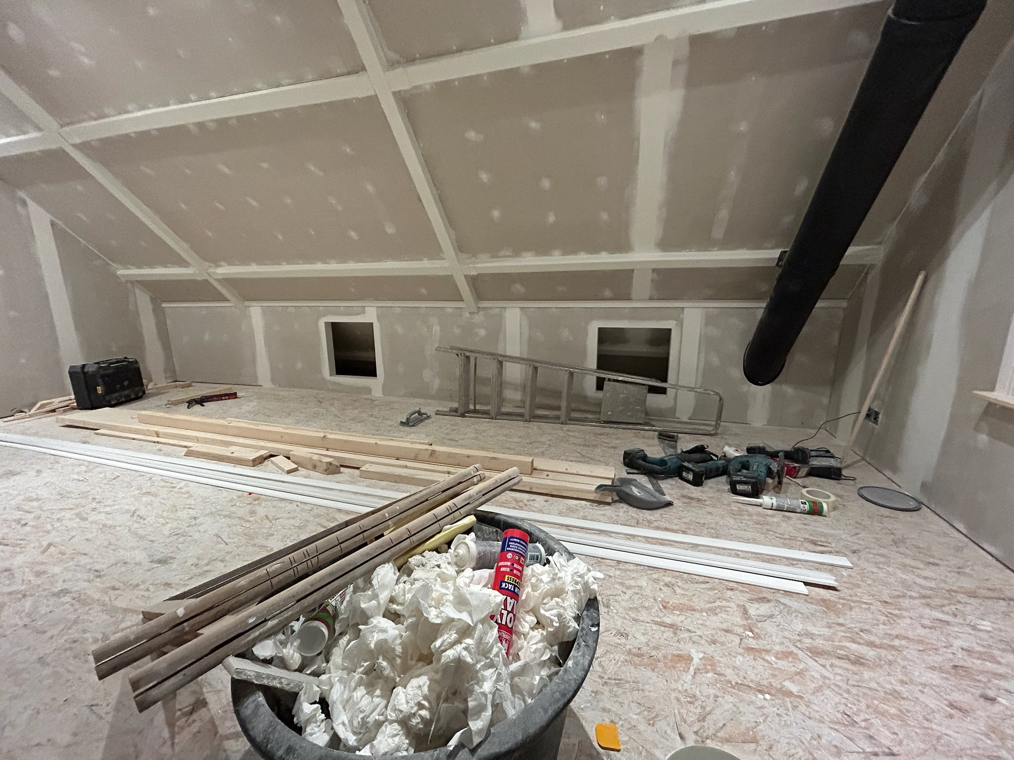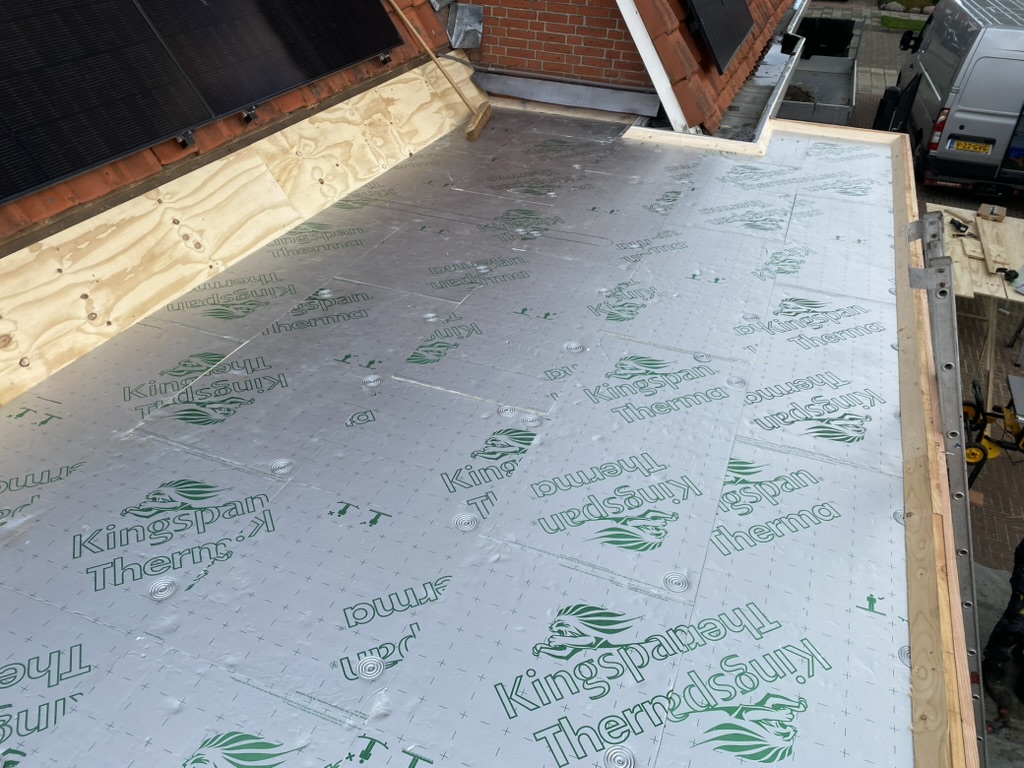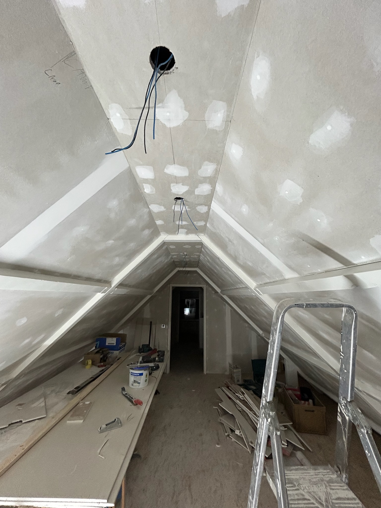 Bij de verbouwing op de 1e verdieping van deze woning hebben we ook de toegang verbetert middels een nieuwe trap. Verder is het de dak van binnenuit geïsoleerd en afgewerkt met gips platen net als beide kopgevels en hebben we de ruimte achter de knieschotten optimaal benut door er kast ruimte in de verwerken.