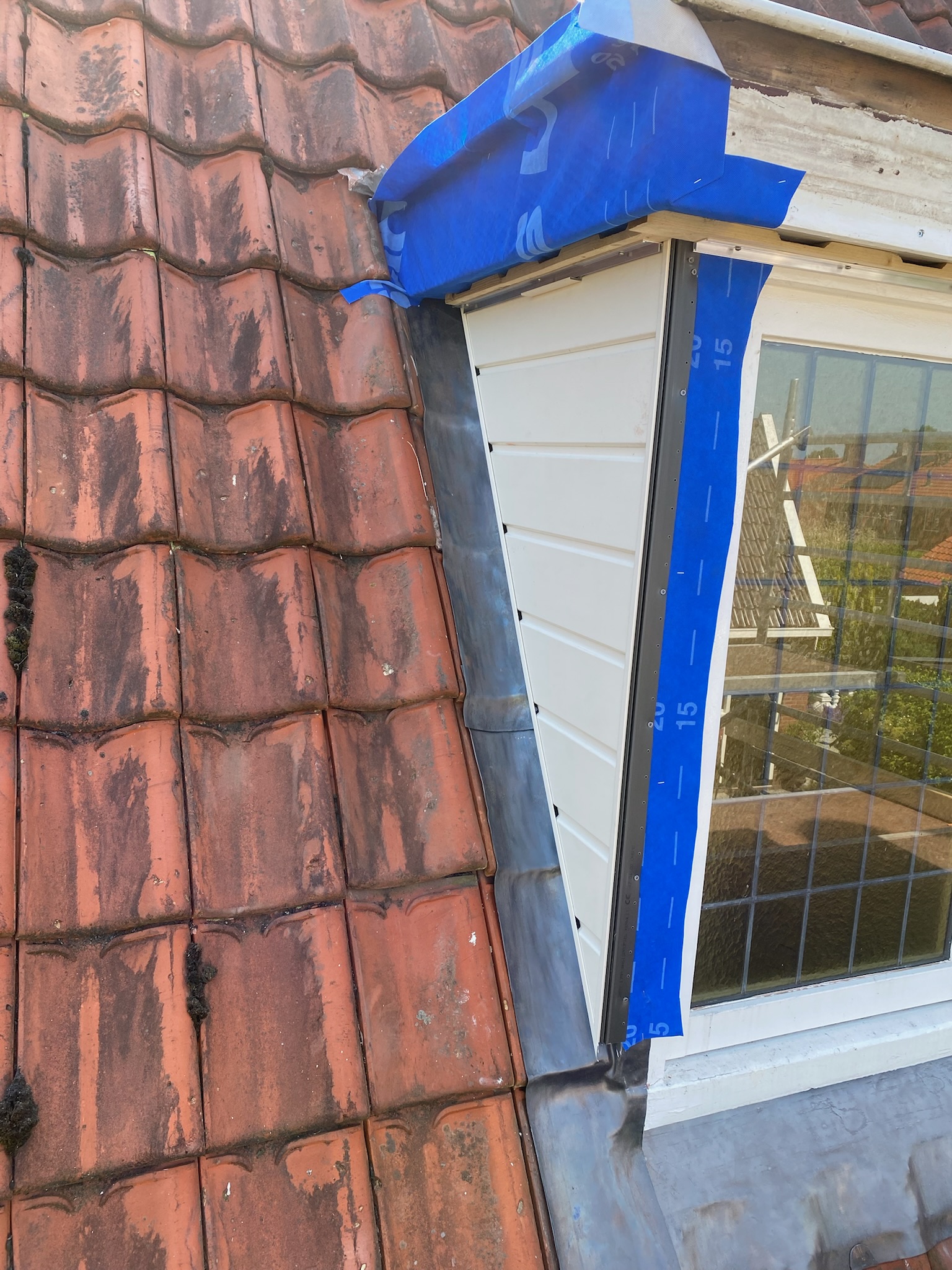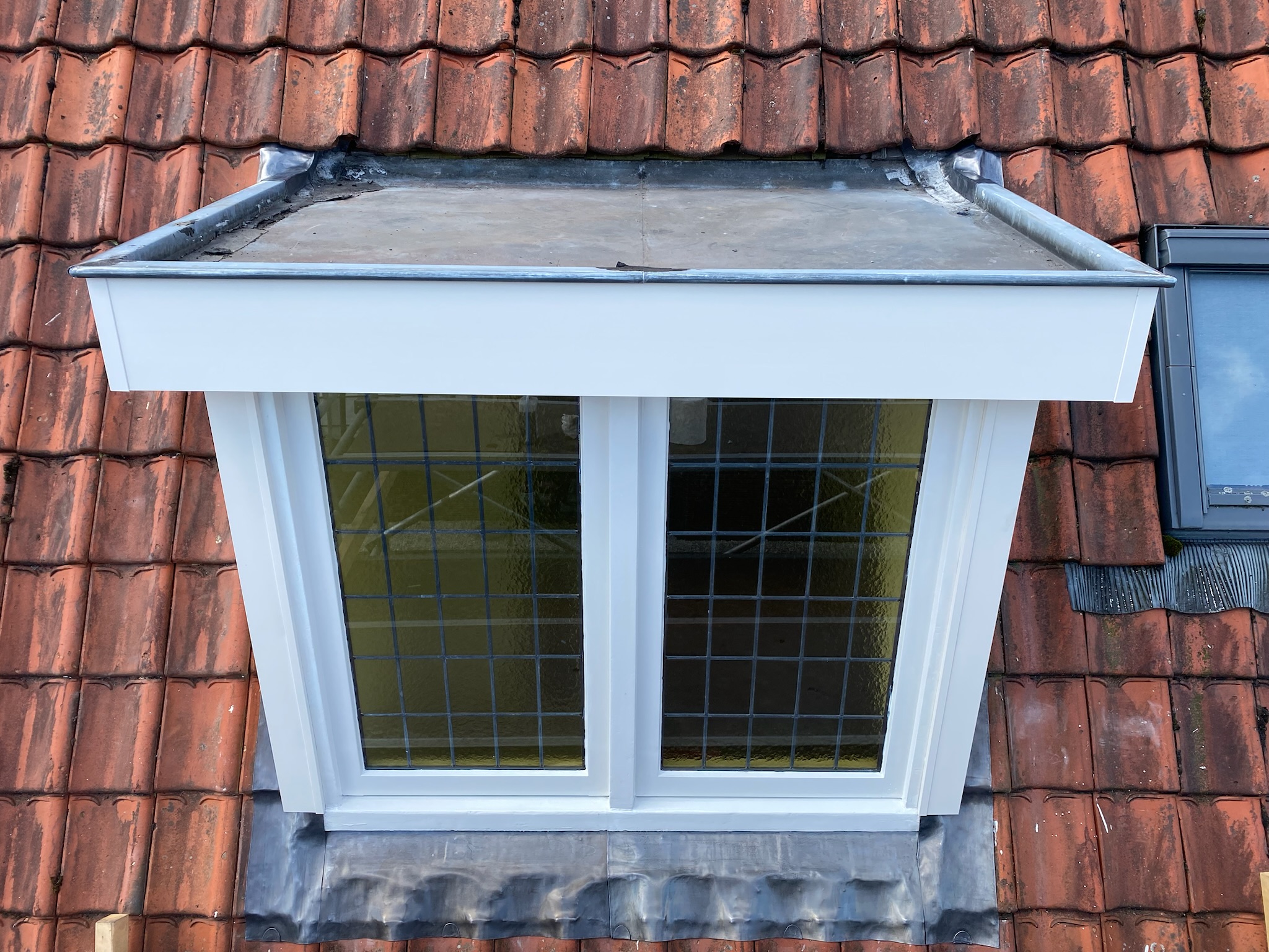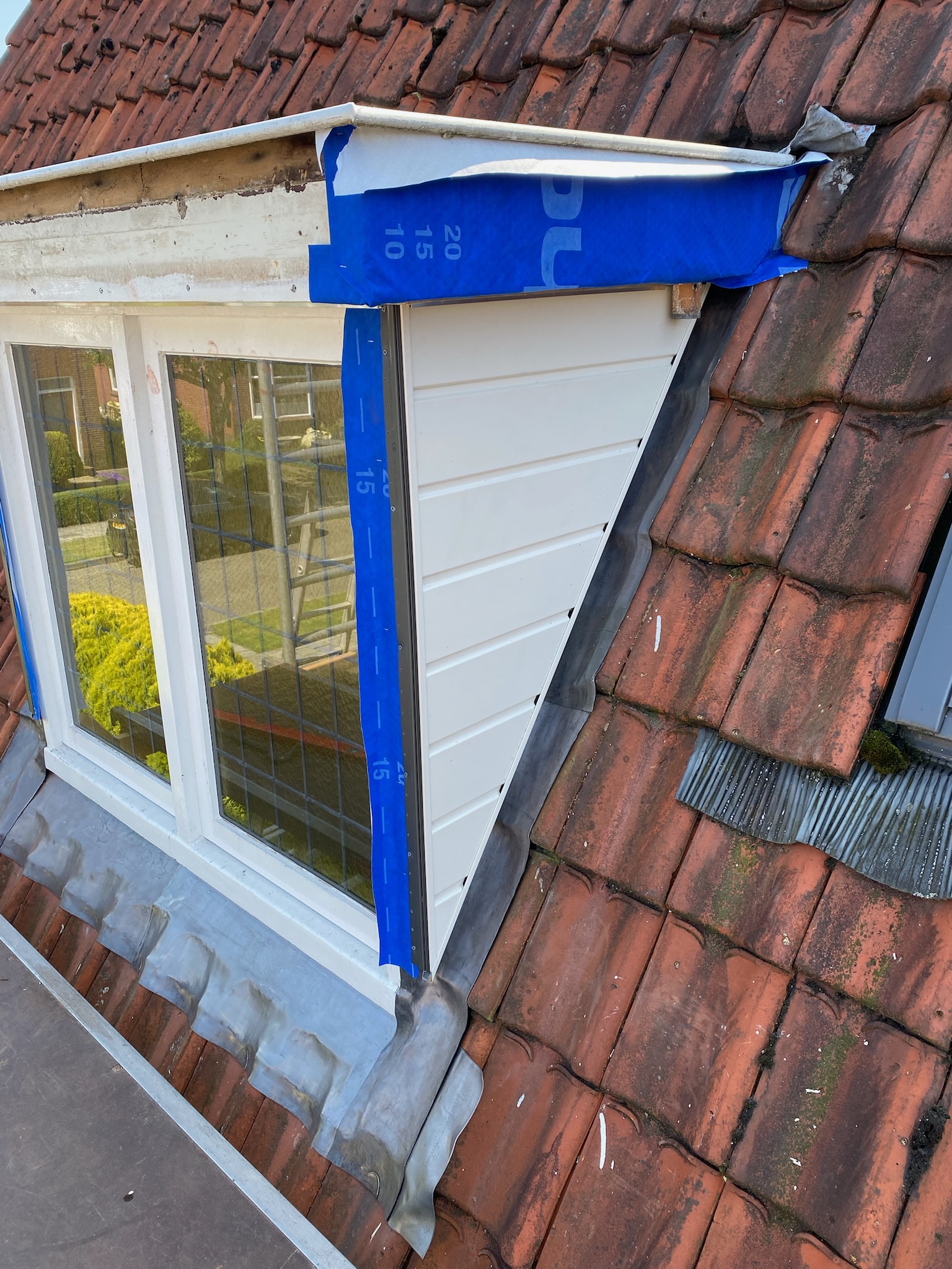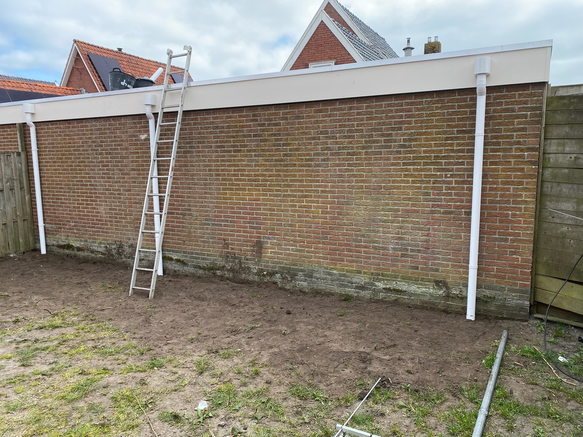 Ook hebben we rondom de bestaande aanbouw de boeidelen vervangen voor keralit, is de dakbedekking vervangen en hebben we aan de achterkant 4 nieuwe hemelwater afvoeren aangebracht, lood vervangen en een stukje bevingschade hersteld.