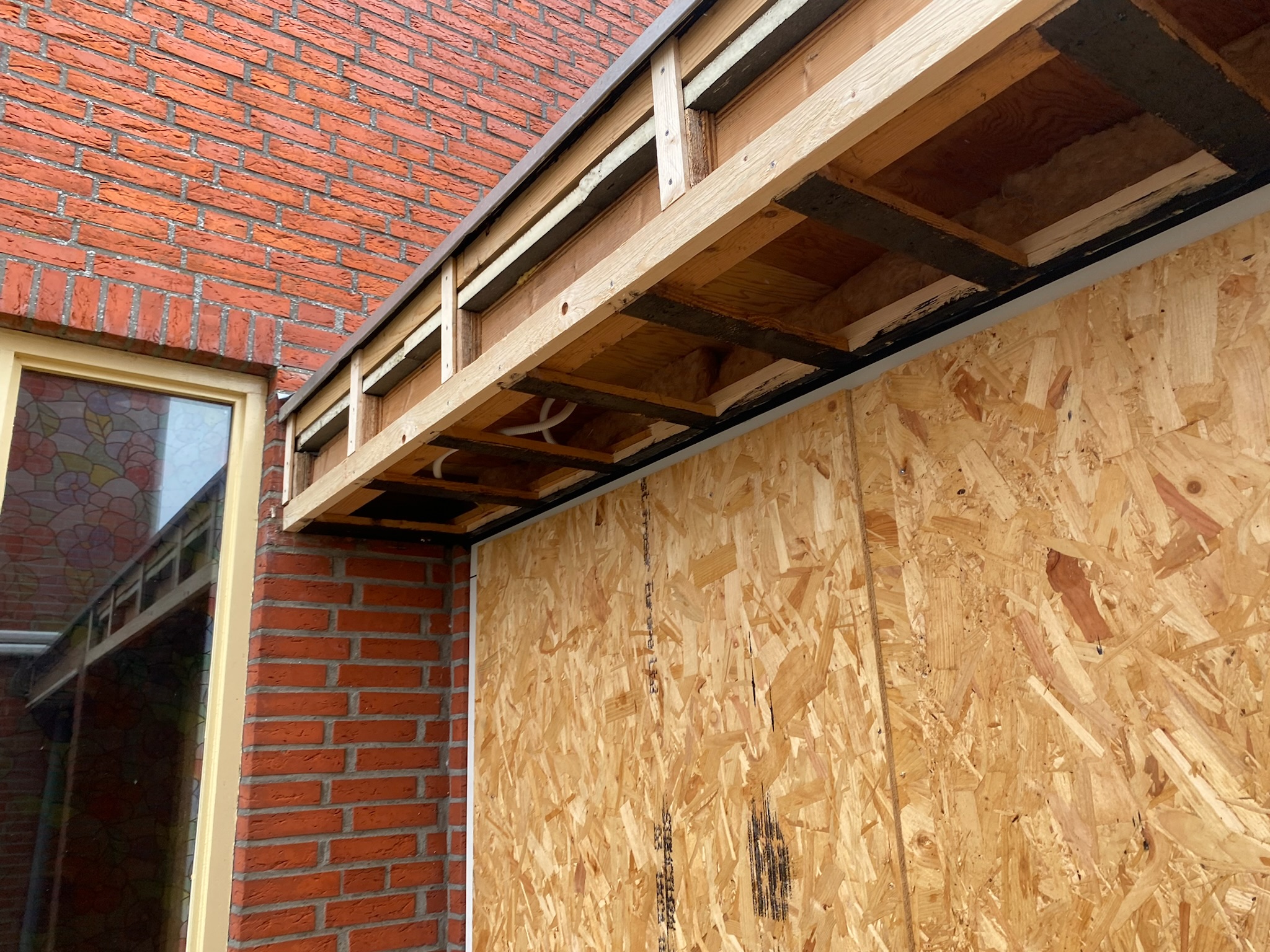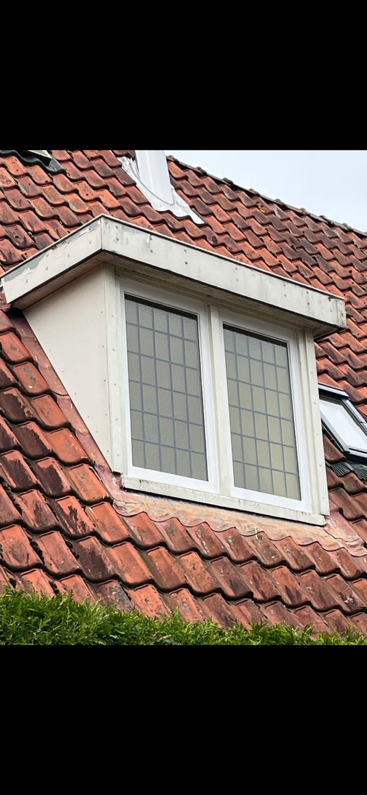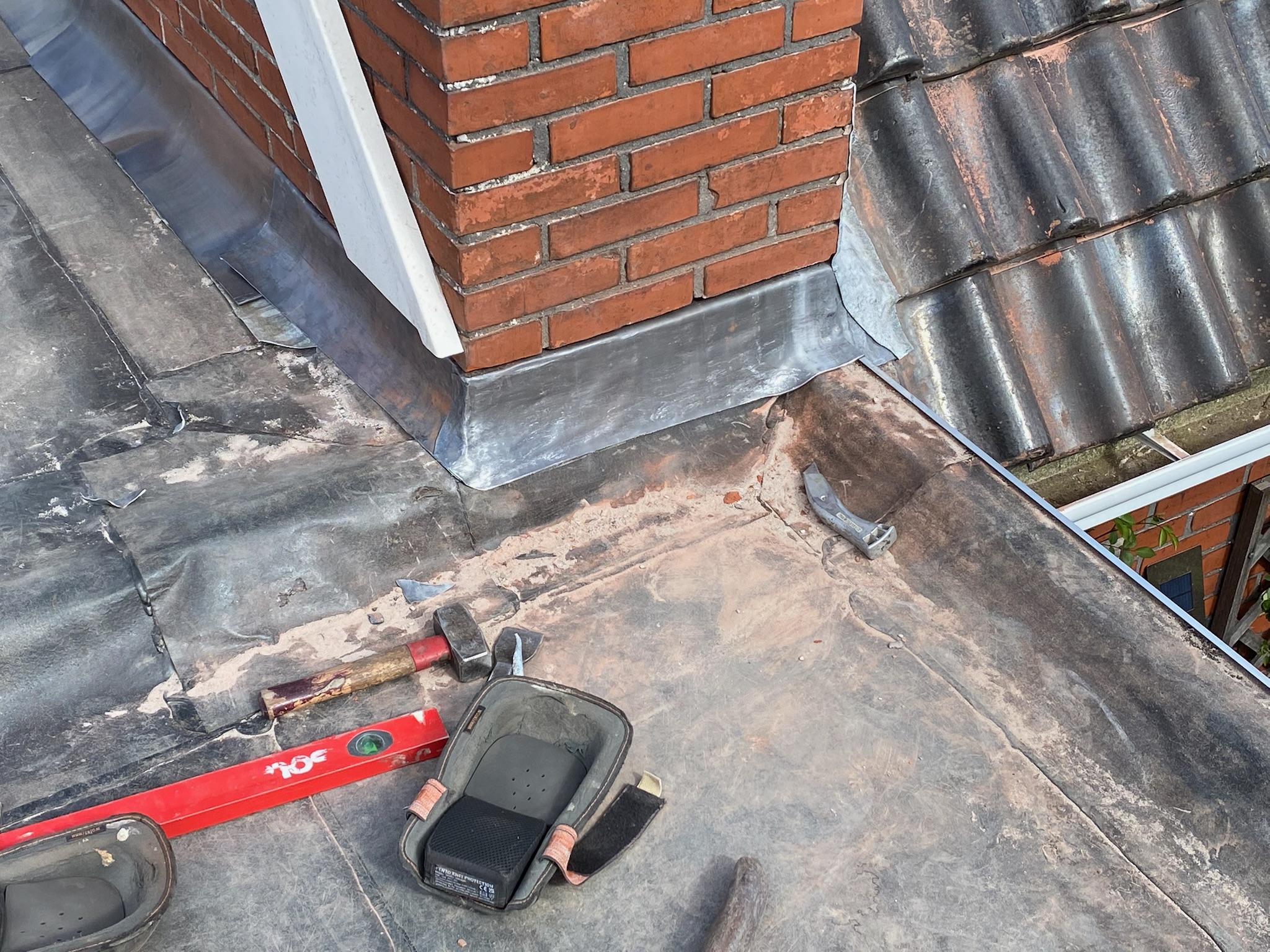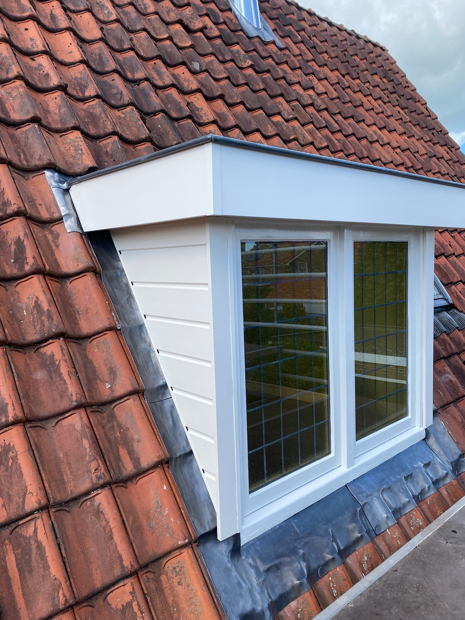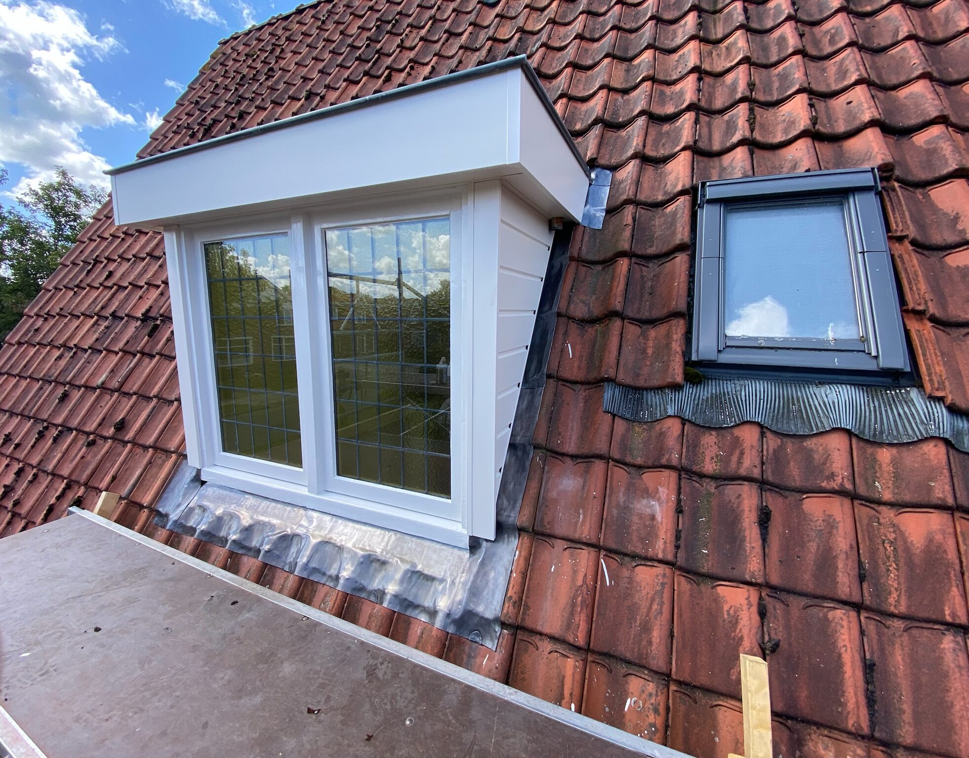 Ook hebben we rondom de bestaande aanbouw de boeidelen vervangen voor keralit, is de dakbedekking vervangen en hebben we aan de achterkant 4 nieuwe hemelwater afvoeren aangebracht, lood vervangen en een stukje bevingschade hersteld.