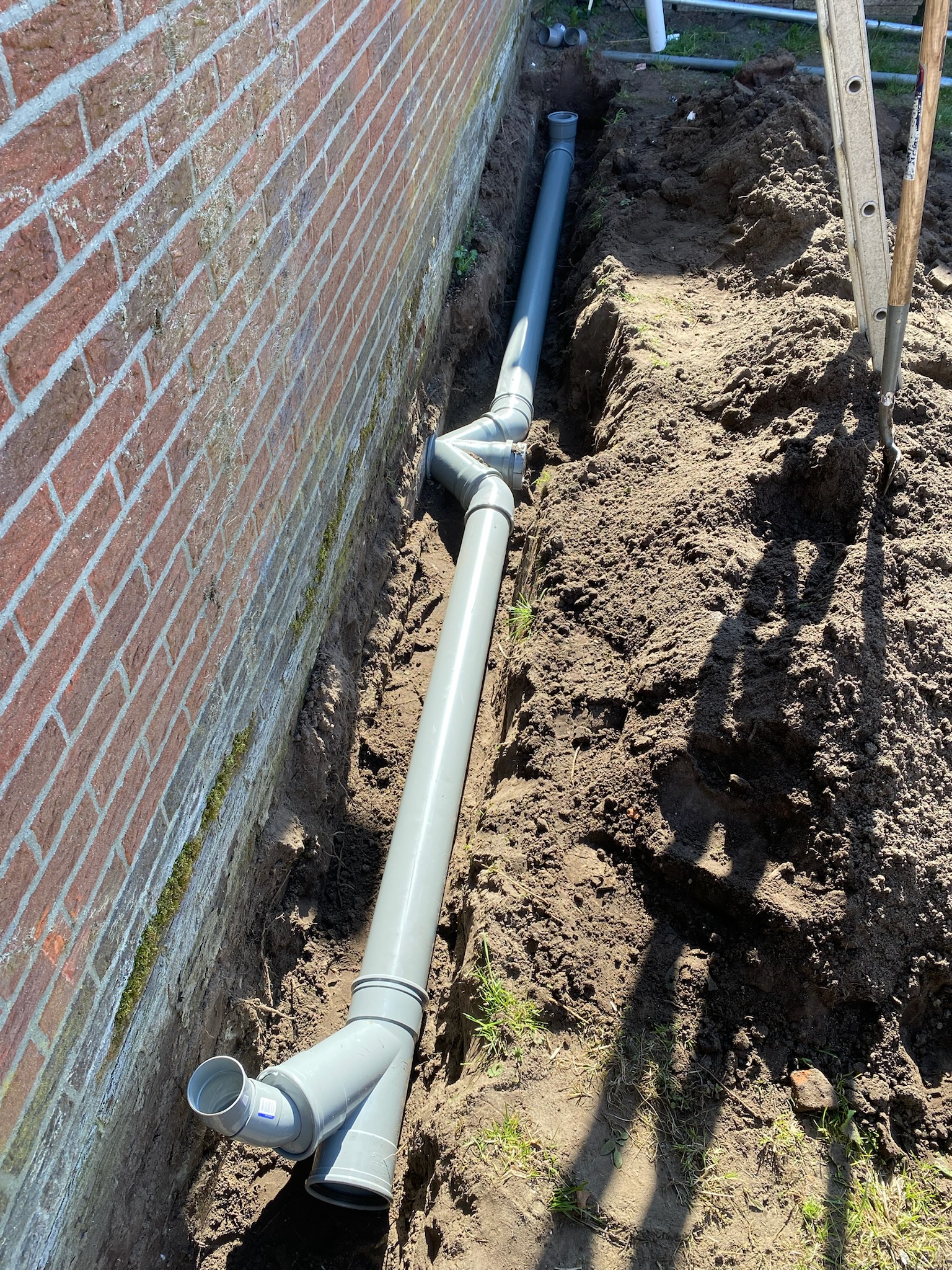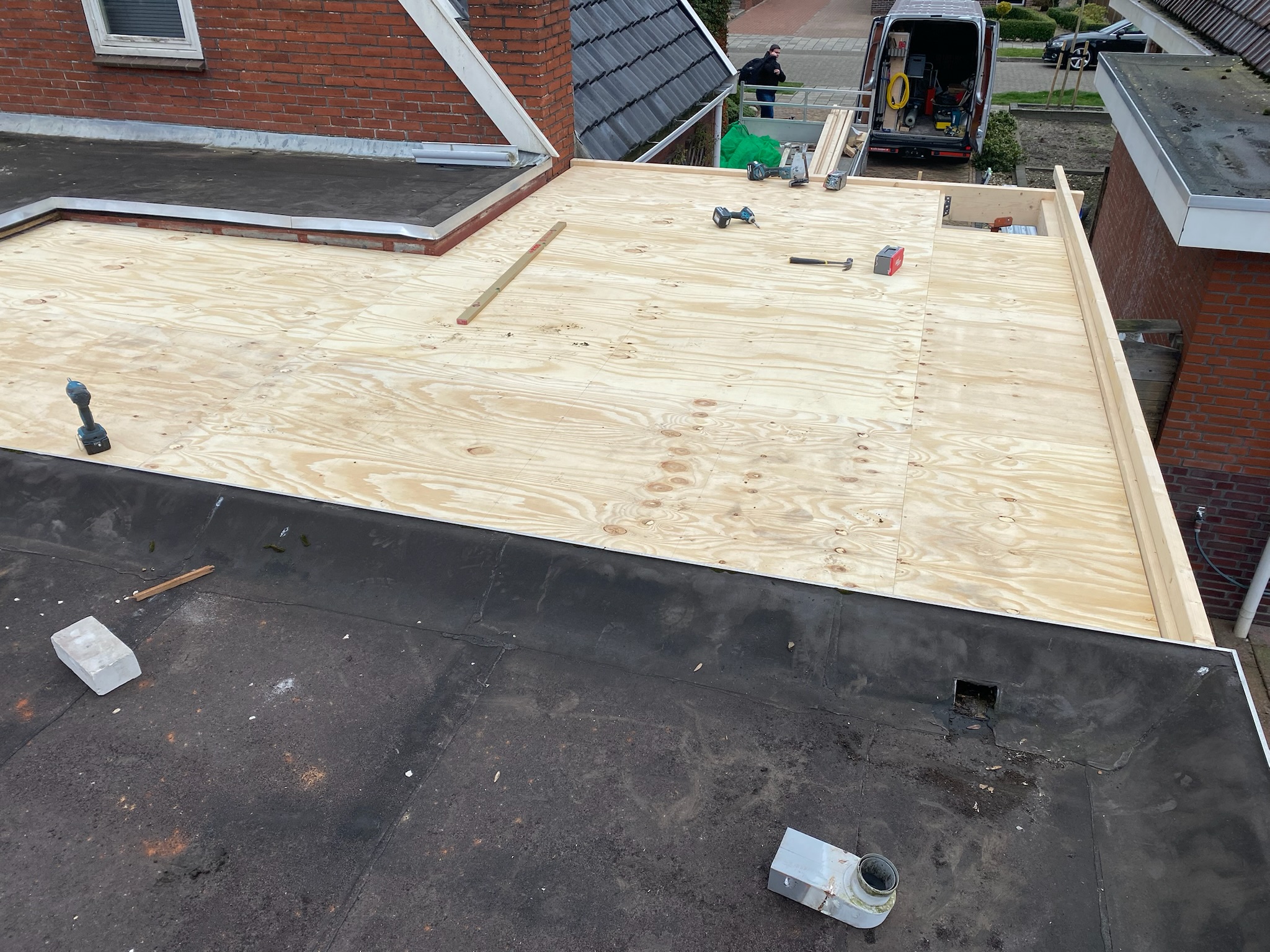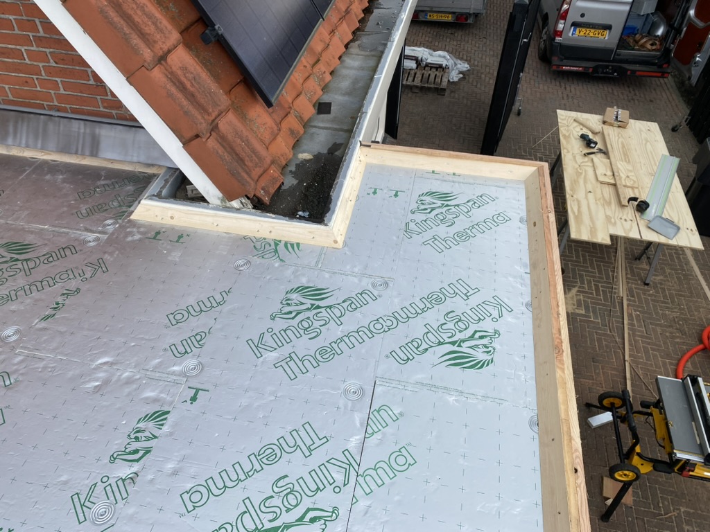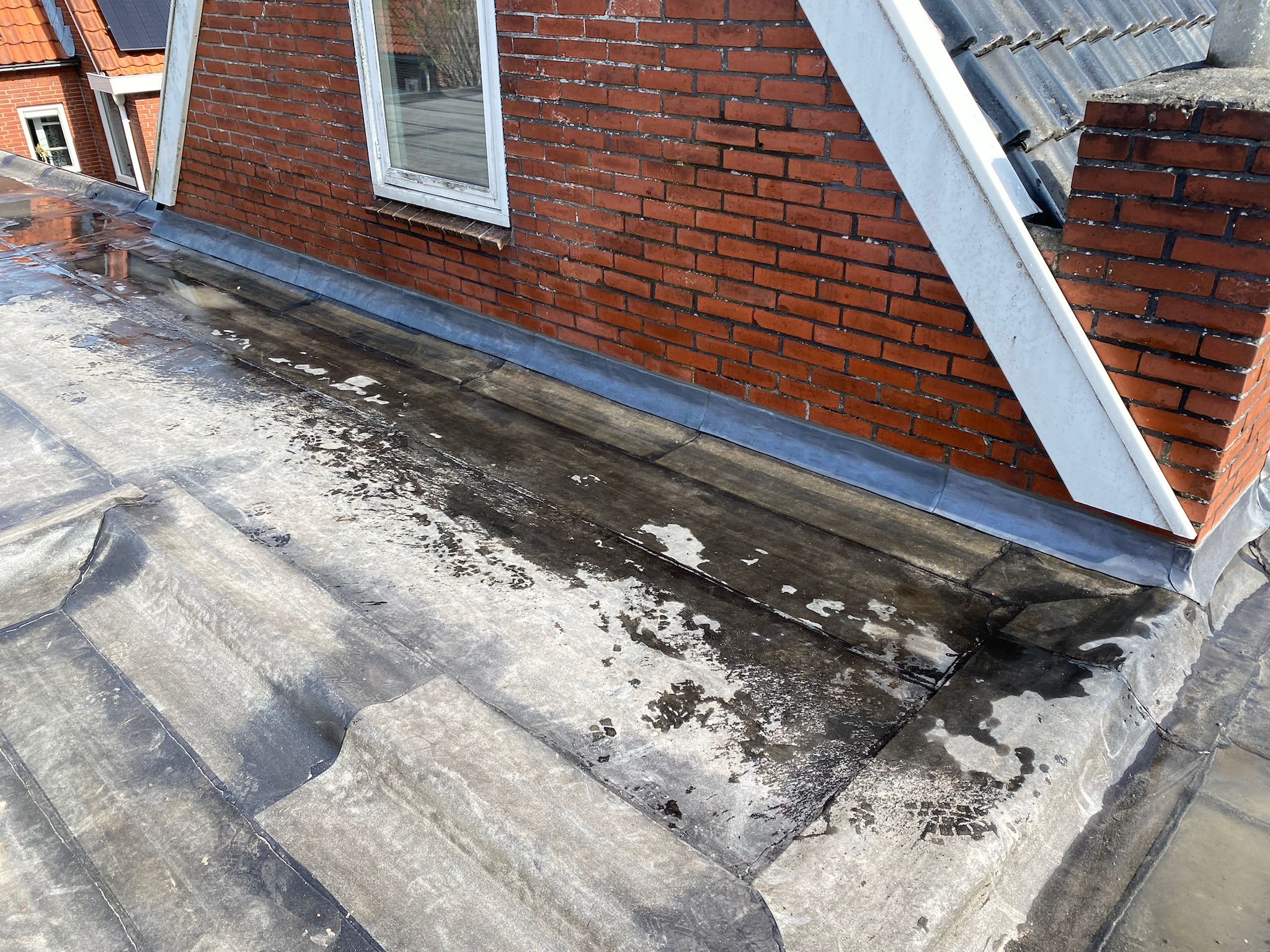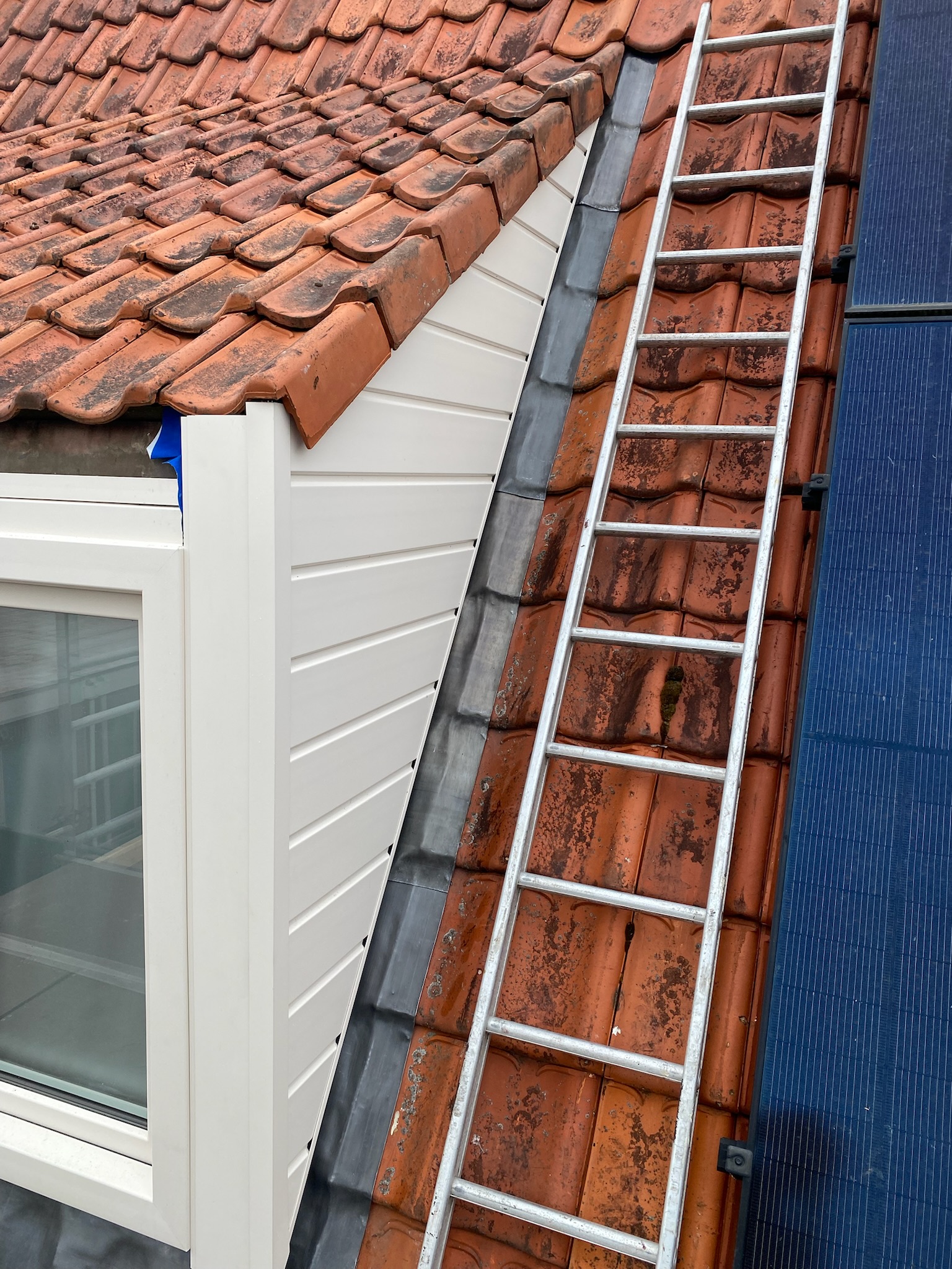 Ook hebben we rondom de bestaande aanbouw de boeidelen vervangen voor keralit, is de dakbedekking vervangen en hebben we aan de achterkant 4 nieuwe hemelwater afvoeren aangebracht, lood vervangen en een stukje bevingschade hersteld.